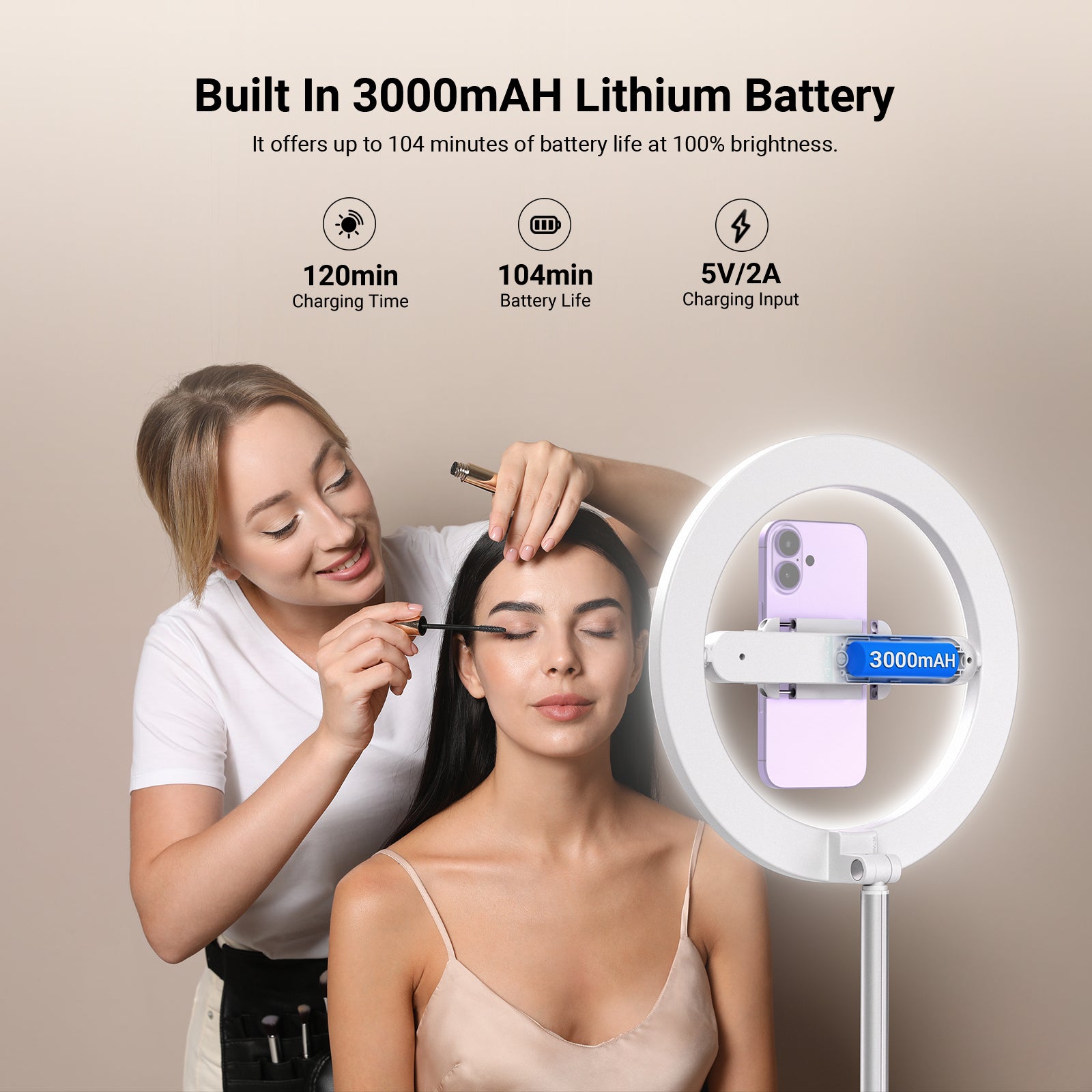 - Built in 3000mAh Battery & USB Powered- With a built in 3000mAh rechargeable battery, the selfie light offers up to 104 minutes of runtime at 100% brightness. It also supports direct 5V/2A or 5V/1A USB power input to provide continuous lighting for uninterrupted shooting. NOTE: For optimal battery longevity, please fully charge the device before first use