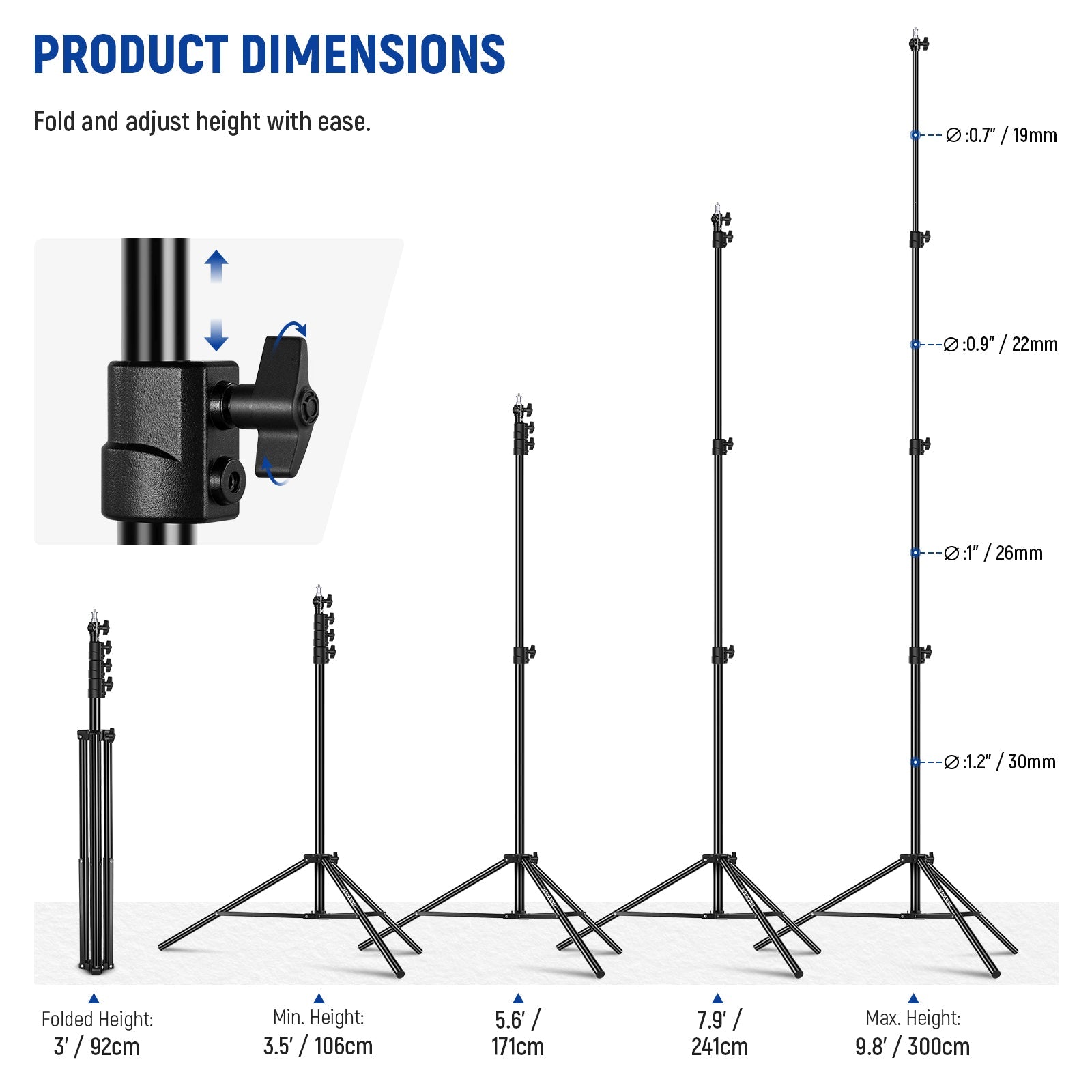 - Simple Height Adjustment- Raise the 4-section telescopic center column from 3.5ft to 9.8ft (106cm to 300cm) and secure it with the metal knobs for exceptional locking strength. The wide height range enables flexible device positioning while the collapsible design makes transport and storage effortless