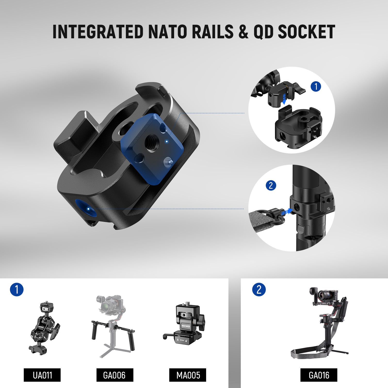 - Integrated NATO Rails & QD Socket- Built in NATO rails with spring loaded safety pins can firmly mount GA006 Dual Handgrips, MA005 Monitor Mount, UA011 Magic Arm, and other accessories with NATO clamps. A QD socket allows efficient and secure attachment of the GA016 Shoulder Strap