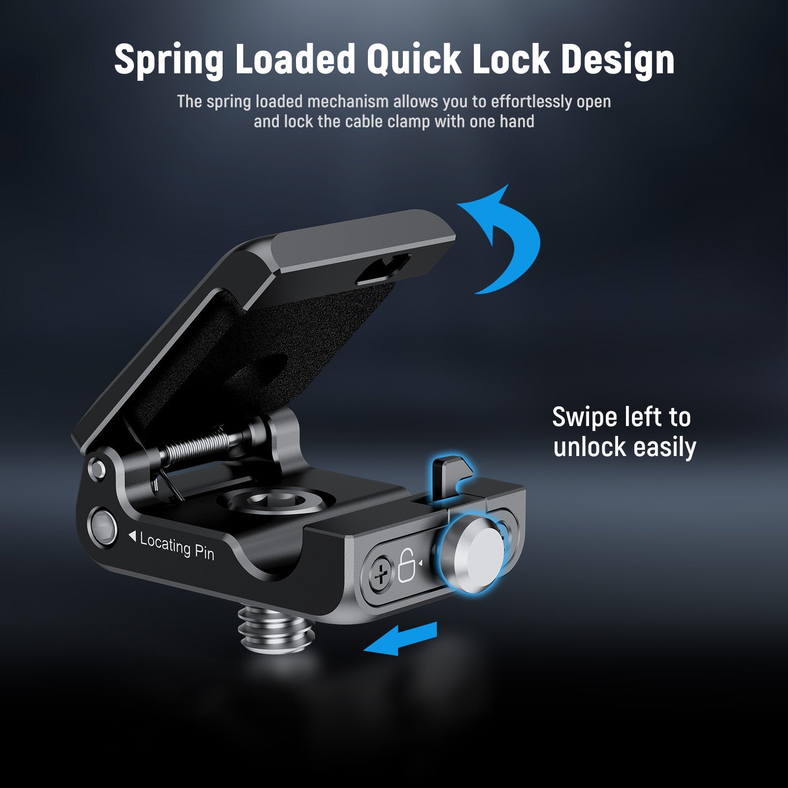 - Spring Loaded Quick Lock Design- The spring loaded mechanism allows you to effortlessly open and lock the cable clamp with one hand