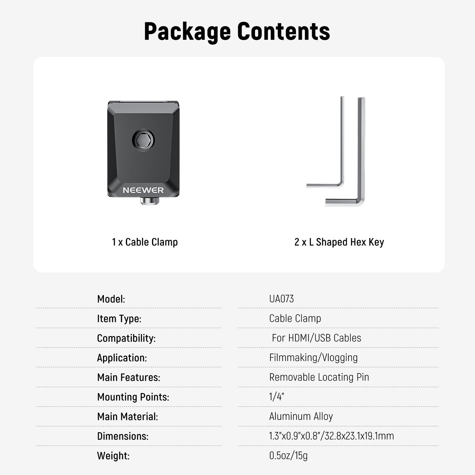- Universal 1/4" Mounting Screw- With a 1/4" screw, the cable clamp can firmly attach to a camera cage, L plate, baseplate, video rig, and phone cage stabilizer with an L shaped hex key