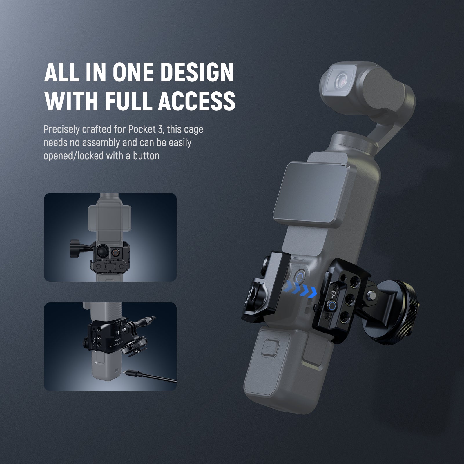 - All In One Design with Full Access- Precisely crafted for Pocket 3, this cage needs no assembly and can be easily opened/locked with a button. The formfitting design ensures full access to buttons and the rotatable screen, and keeps the charging port completely unblocked