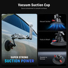 - Safe vacuum car suction cup: the suction cup with vacuum pump ensures a secure attachment to smooth surfaces such as bonnets and windscreens and provides a stable neck. The 360° swivel base allows for smooth and continuous rotation for panoramic shots. Warm Tips Please clean the suction cup and contact surface thoroughly before use and make sure all screws are tightened tightly. Note: Use at speeds below 80 km/h