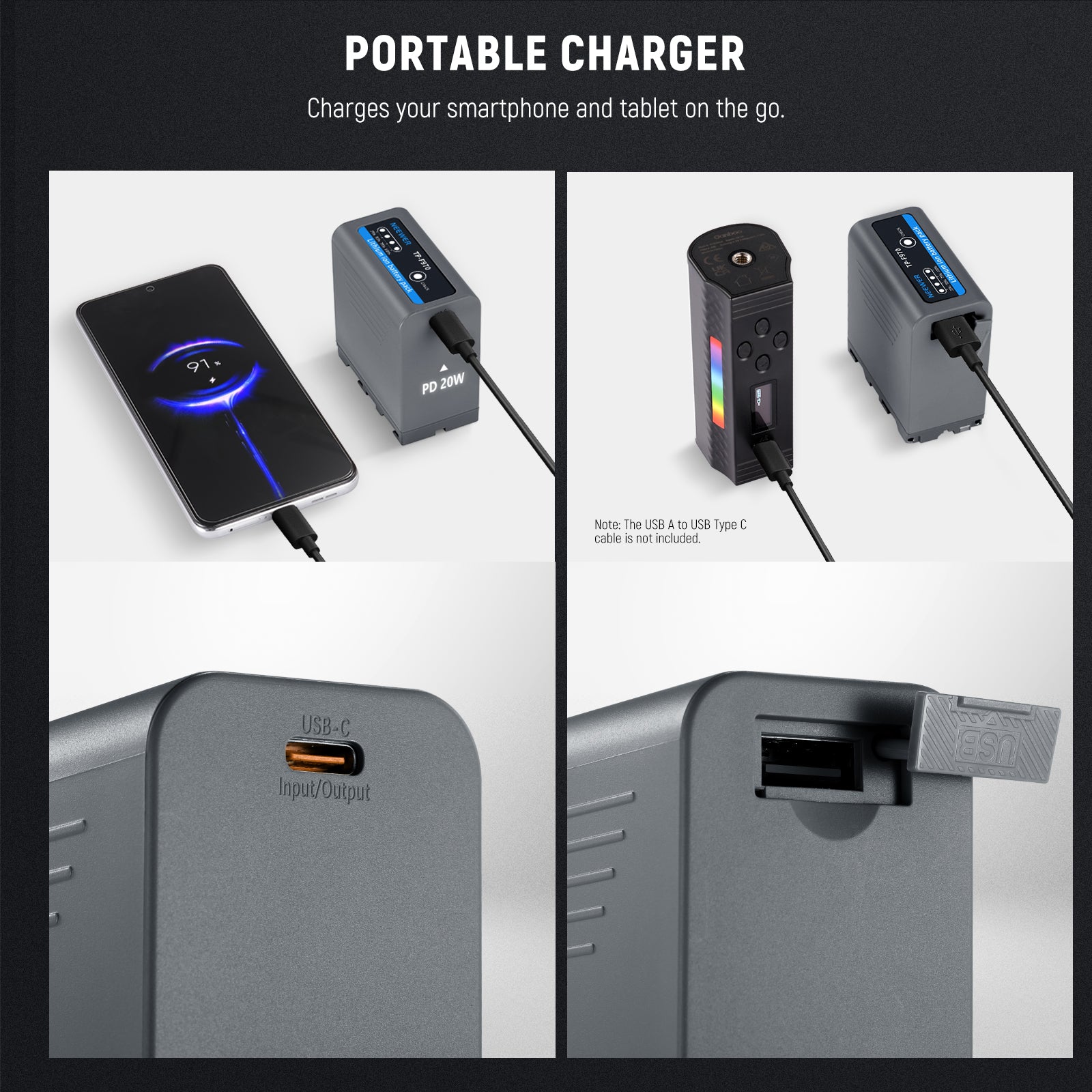 - 4.8H Full Charge Time with PD 20W Fast Charging- This rechargeable np-f970 battery features a bidirectional USB Type C input/output port that supports 20W PD fast charging, fully charging the battery only takes 4.8 hours via a wall charger! A USB Type C fast charging cable is included. PD 20W wall charger is NOT included