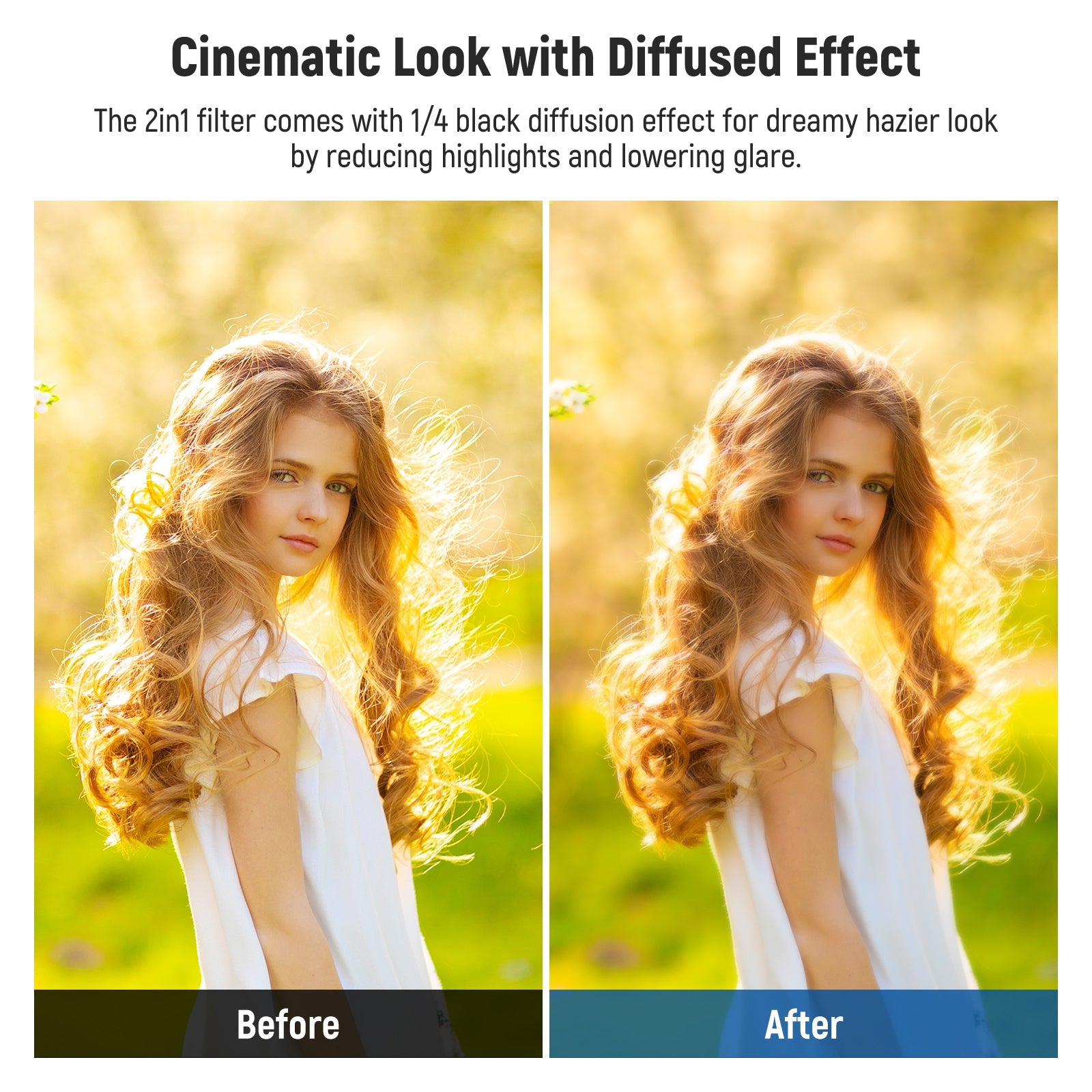 • Cinematic Look with 1/4 Black Diffusion Effect- The filter also comes with black diffusion 1/4 effect for dreamy hazier look by reducing highlights and lowering glare. It helps make skin look smoother in portrait photography