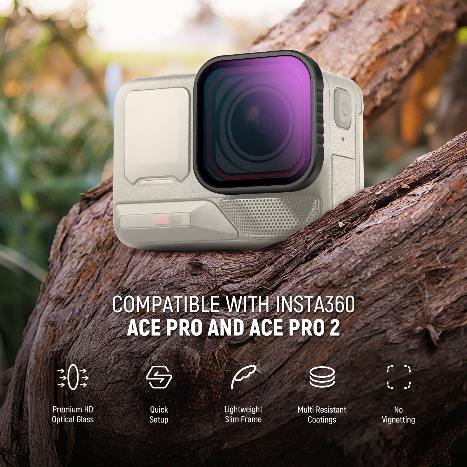 - For Ace Pro and Ace Pro 2- This 4-pack filter set (adjustable CPL + UV + black diffusion 1/4 + ND16) is compatible with Insta360 Ace Pro & Ace Pro 2. Each directly snaps onto the lens and stays in place via the rubber seal. Multiple coatings resist water, fingerprints, and scratches. Note: Not for underwater use, as water will enter and degrade image quality