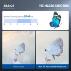- 15x Magnification for Close Ups- To use the macro lens, simply unscrew the wide angle lens. It offers 15x magnification with a 2-4cm optimal shooting distance. The lens provides a beautiful bokeh effect, ideal for capturing detailed shots of insects, jewelry, coins, plants, and other close ups