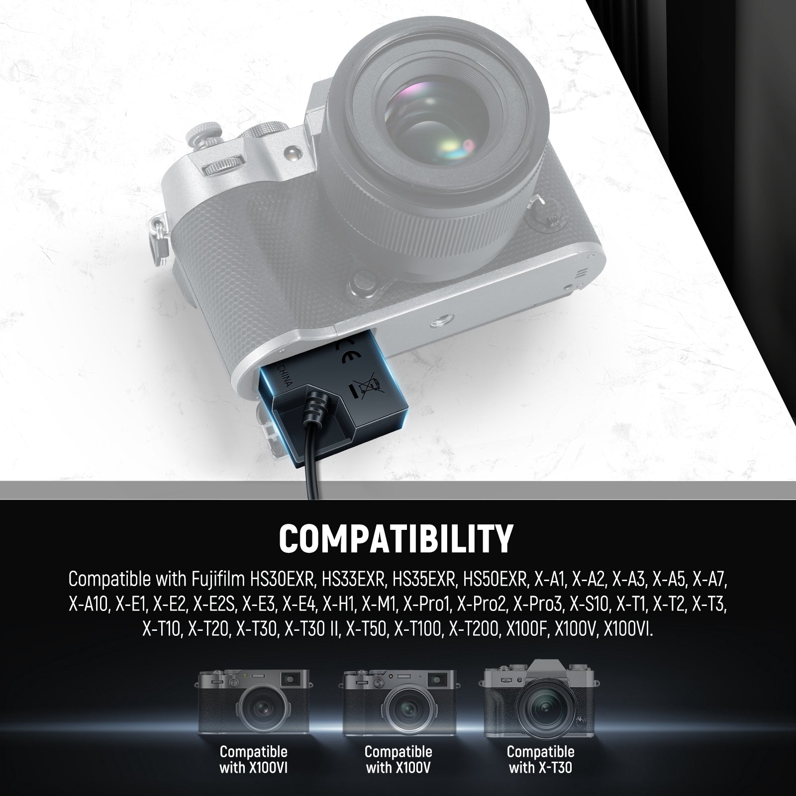- Compatibility- This dummy battery kit is compatible with FUJIFILM HS30EXR, HS33EXR, HS35EXR, HS50EXR, X-A1, X-A2, X-A3, X-A5, X-A7, X-A10, X-E1, X-E2, X-E2S, X-E3, X-E4, X-H1, X-M1, X-Pro1, X-Pro2, X-Pro3, X-S10, X-T1, X-T2, X-T3, X-T10, X-T20, X-T30, X-T30 II, X-T100, X-T200, X100F, X100V, X100VI cameras