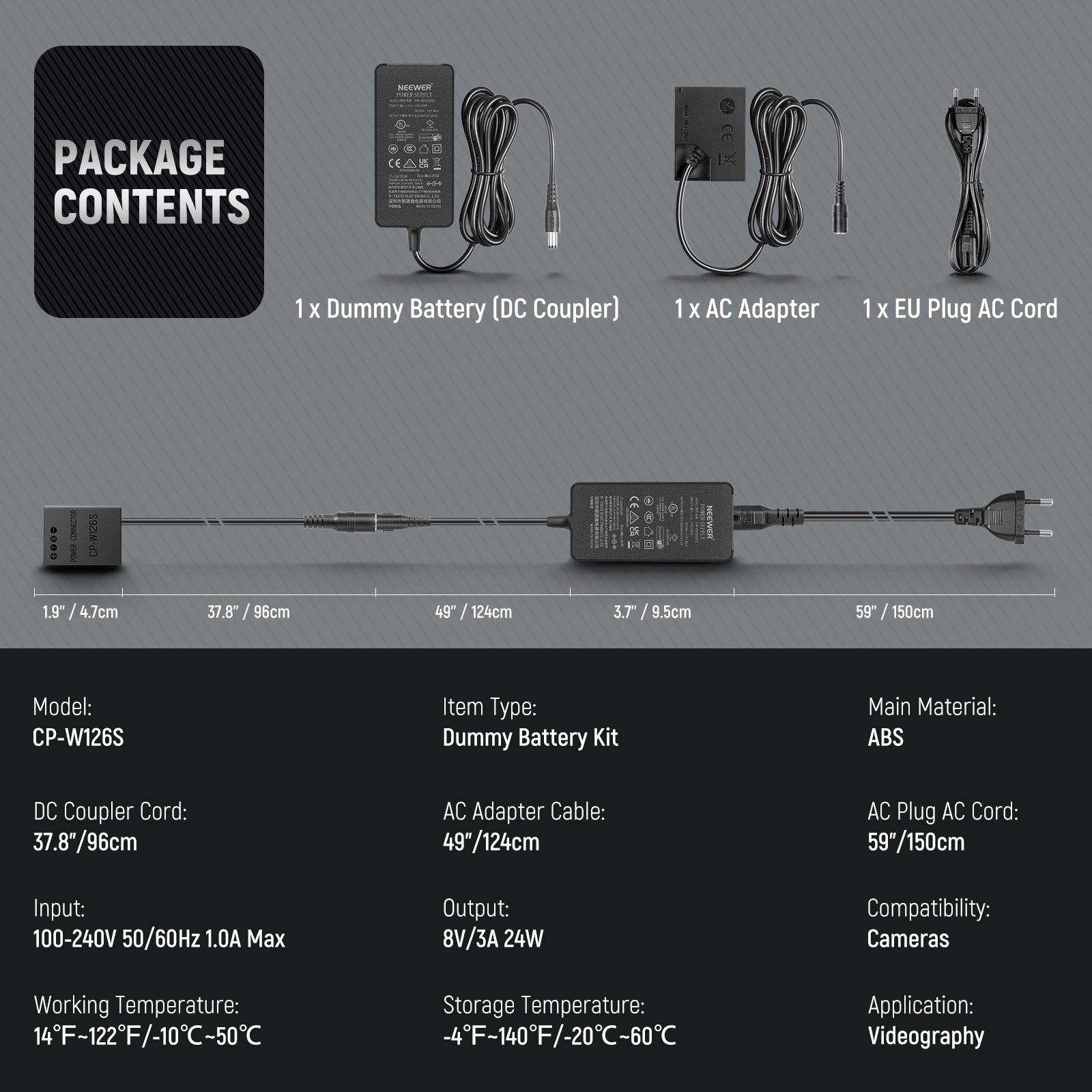 - Function- This NP-W126 replacement dummy battery kit can replace the NP-W126 & NP-W126S batteries. The NP-W126 AC power adapter can offer continuous power to your camera from the AC outlet. You no longer need to worry about running out of the camera battery when you're taking long time studio shooting, downloading, and viewing videos or pictures with a TV or VCR connected