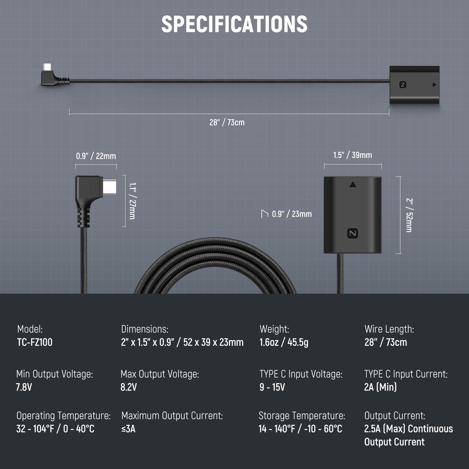 NEEWER TC-FZ100 USB C to NP-FZ100 Dummy Battery 8.2V Output for Portable Charger