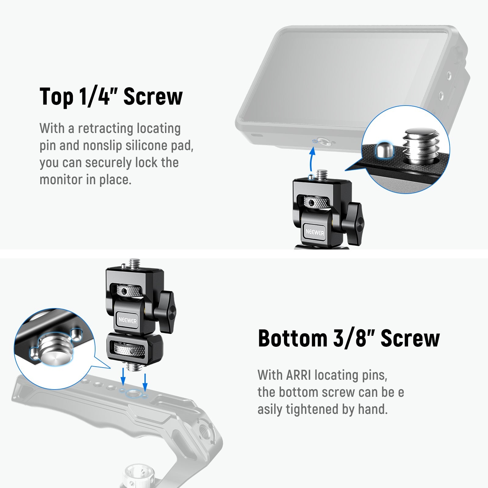 - Dual Anti Twist Design- Top 1/4" screw with retracting anti twist locating pin and nonslip silicone pad securely lock NEEWER F100 F200 F400 PRO F500 and other monitors (compatible with Atomos Ninja V Ninja V+). Plus, the knurled thumbscrew allows quick hand fixation, and slots with included L shaped hex key provide added security for retightening