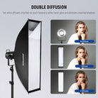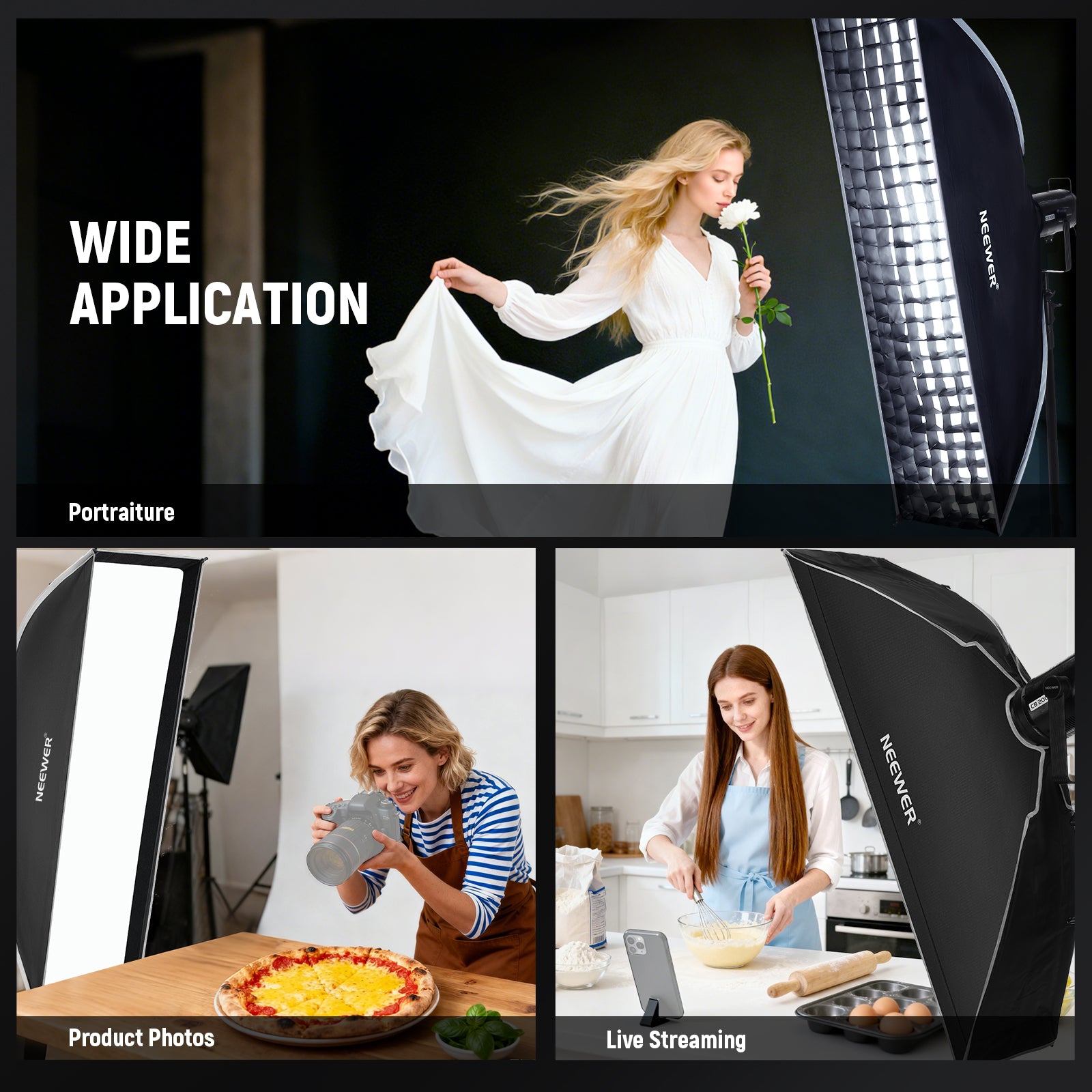 - Premium Rectangular Softbox- This 24" x 35" / 60 x 90cm rectangular softbox features a glossy silver lining that broadens and diffuses the output while retaining a neutral color rendering index (CRI) and color temperature. Even light distribution can minimize blemishes and shadows, smoothen your skin, and define facial structures