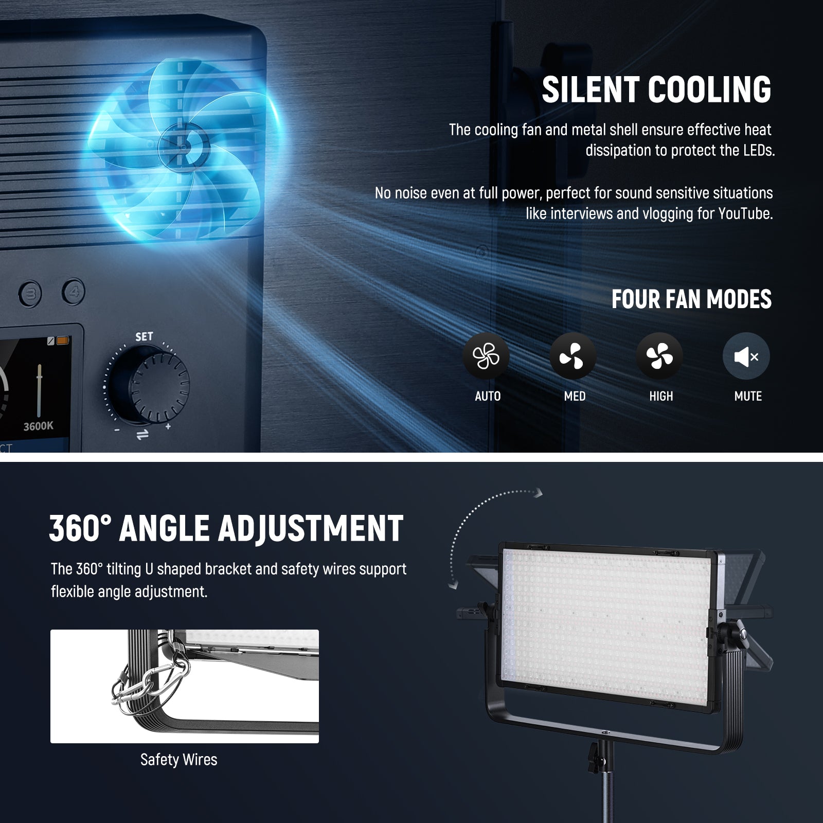 - Silent Cooling Fan & Smart FM Mode- This light features a super quiet cooling system optimized for on set recording, ensuring 100% full power output while minimizing fan noise. It offers Smart, Medium, High, and Silent modes to create a nearly silent shooting environment. The sturdy metal casing accelerates heat dissipation, prolonging the light's lifespan. The built in intelligent FM mode adjusts the light frequency to prevent flickering during high speed shooting