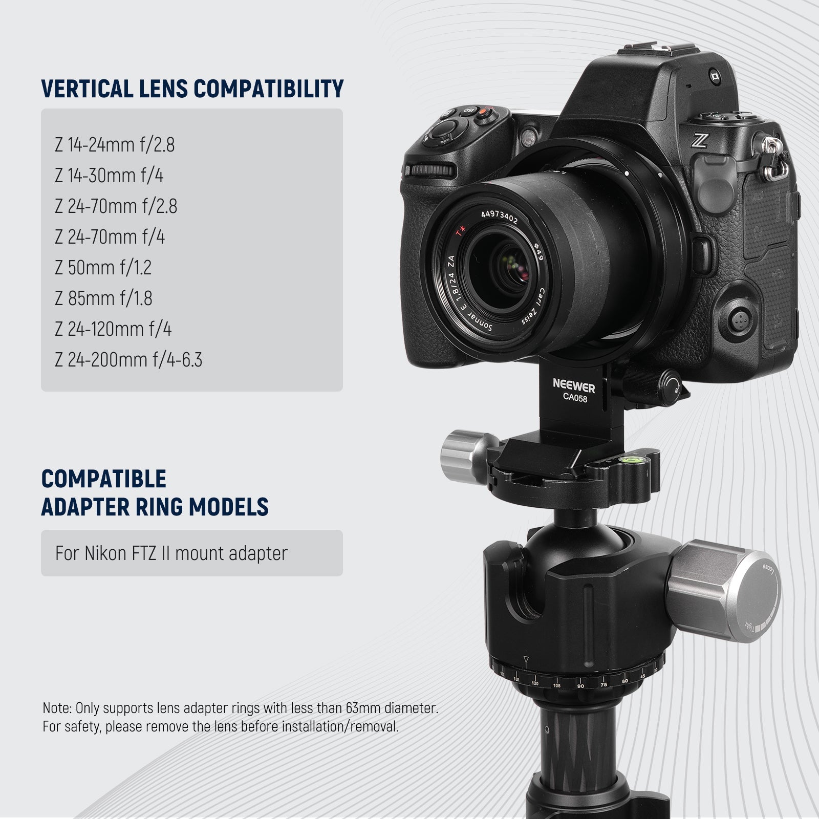 • Flexible Angles & Improved Balance- This NEEWER CA058 rotatable collar camera mount plate seamless quick horizontal to vertical shots without compromising stability, and enhances balance when using telephoto or other heavy lenses. Compatible with Nikon Z8 Z7 II Z6 II Z5 cameras FTZ II mount adapter Z 24-70mm f/2.8 50mm f/1.2 24-120mm f/4 14-24mm f/2.8 85mm f/1.8 24-70mm f/4 14-30mm f/4 24-200mm f/4-6.3 lenses. Note: not compatible with Z 70-200mm f2.8
