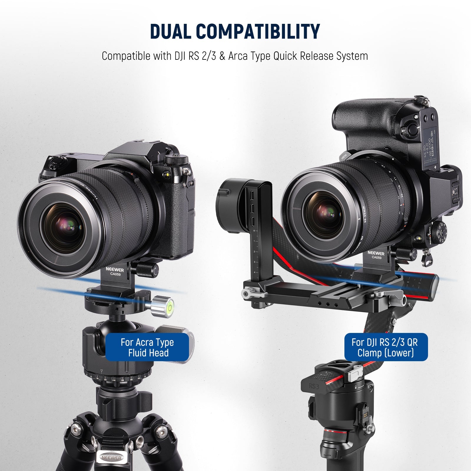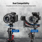 • Quick Release Camera Mounting- This vertical camera tripod lens mount is equipped with a quick release base plate that is both compatible with Arca Swiss DJI RS3 Pro RS3 Mini RS3 RS2 Pro RS2 vertical camera mount, and easily installed on any tripod, gimbal stablizer, monopod, and camera slider with an identical mounting system. The 4 x 1/4" and 1 x 3/8" threads on the bracket bottom for camera rigs, hand grips, magic arms and more