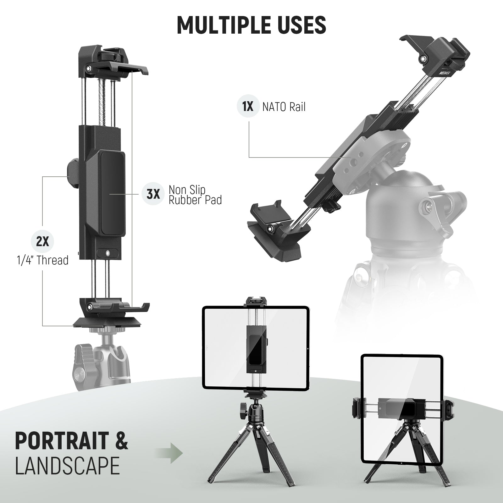 - Multi Functional Tablet Tripod Mount- Made of aluminum alloy, the metal tablet holder securely attaches your tablet or smartphone to tripod heads, magic arms, and more for flexible use. Its wide clamping range is compatible with most tablets and phones on the market, ideal for tablet monitoring, live streaming, video recording, Zoom calls, online conferences, remote learning, gaming streaming, etc. The foldable design makes it easy to store and carry