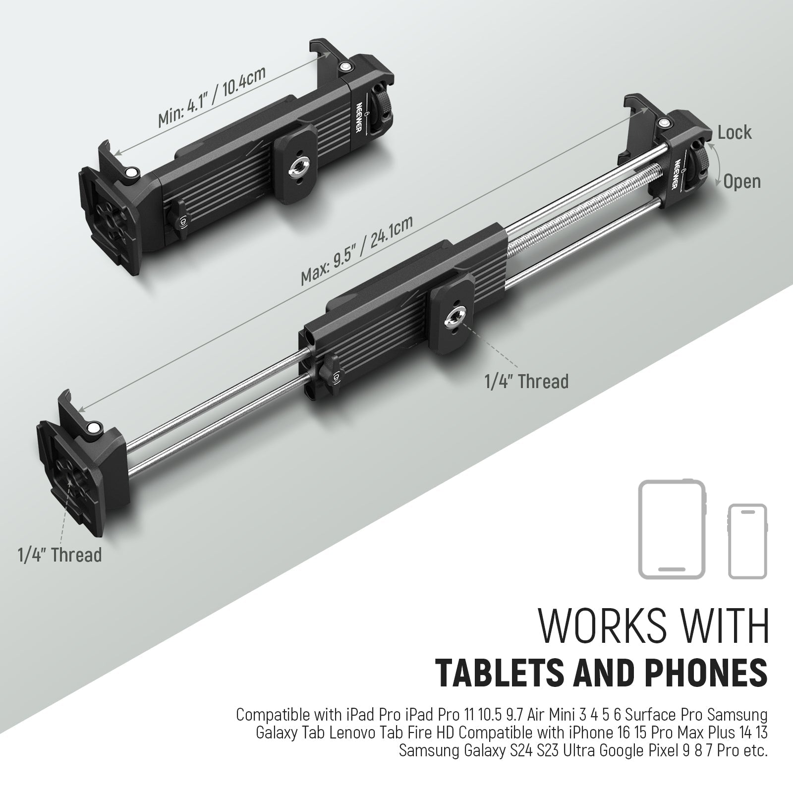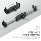 - For Tablets & Phones- Open the clamp, adjust the width (4.1"-9.5" wide, 0.6" thick), insert your phone or tablet, and start using. Compatible with iPad Pro 11 10.5 9.7 Air Mini 3 4 5 6 Surface Pro Samsung Galaxy Tab Lenovo Tab Fire HD series and more, compatible with iPhone 16 15 Pro Max Plus 14 13 Samsung Galaxy S24 S23 Ultra Google Pixel 9 8 7 Pro, etc., the tablet stand supports portrait and landscape modes, even enabling vertical monitoring for smartphones