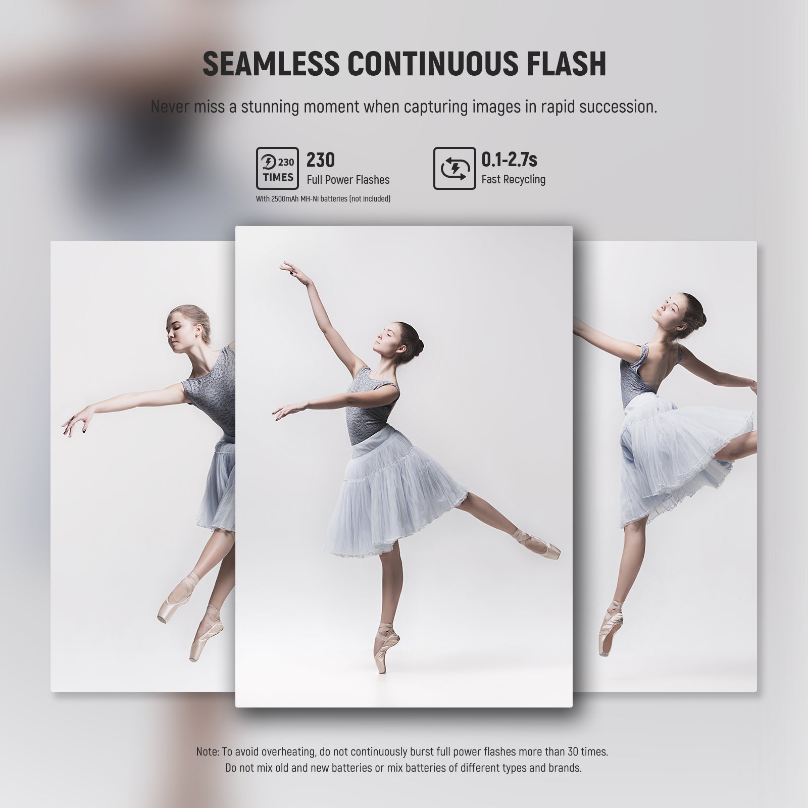 - TTL/M/MULTI Flash Modes- Built with E-TTL II (auto), M (manual), and MULTI (stroboscopic) modes. The M mode supports 81 flash output levels (1/256-1/1) with a TCM switch to quickly convert between TTL and M. It also supports 1/8000s HSS high speed sync, 0.1-2.7s recycling time, 1/300s-1/20000s flash duration, 100 stroboscopic flashes (199Hz), flash exposure compensation (FEC), flash exposure bracketing (FEB), flash exposure lock (FEL), front/rear sync, and optical S1/S2