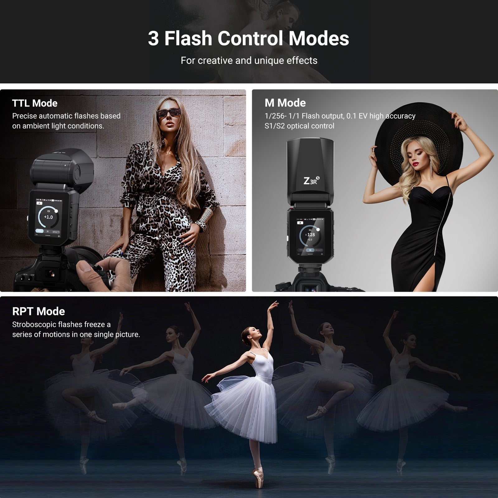 - Intuitive Color Touch Screen- The Z3R-C as an external flash features a large, high definition color touch screen, allowing one touch adjustment of power, mode, and modeling light for clear display and precise control