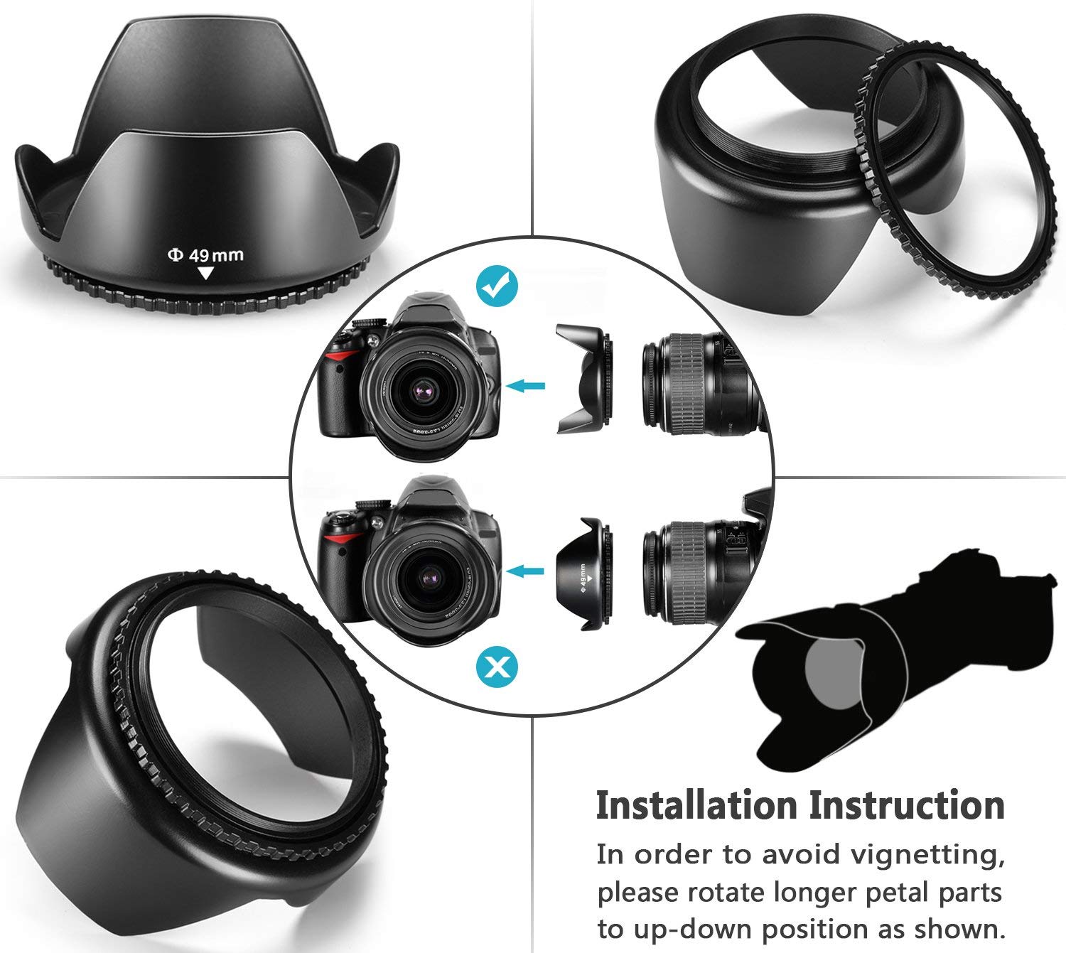 - Two Lens Hood Provided- A tulip-shaped lens hood and a collapsible rubber lens hood helps block excessive sunlight and reduce glare and flare. The collapsible rubber lens hood can be folded into three shapes, tulip, flower, and pedal, for greater versatility. The tulip lens hood is well suited for wide angle lenses as it won’t cause vignetting