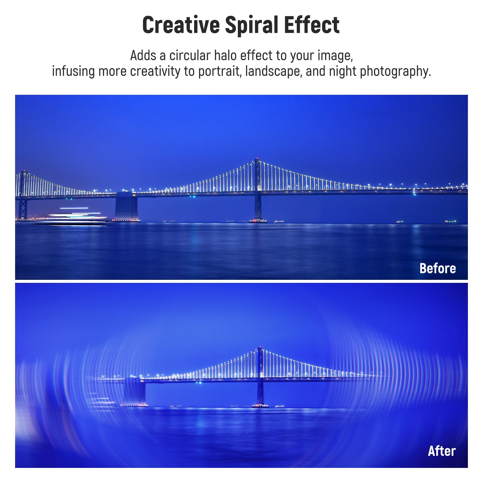 - Enchanting Spiral Halo Effect- This prism effect filter frames your shots with a circular halo, keeping the image clear at the center stage while transitioning the background into a swirling, magnified blur, intensifying the mood and atmosphere without further post-editing