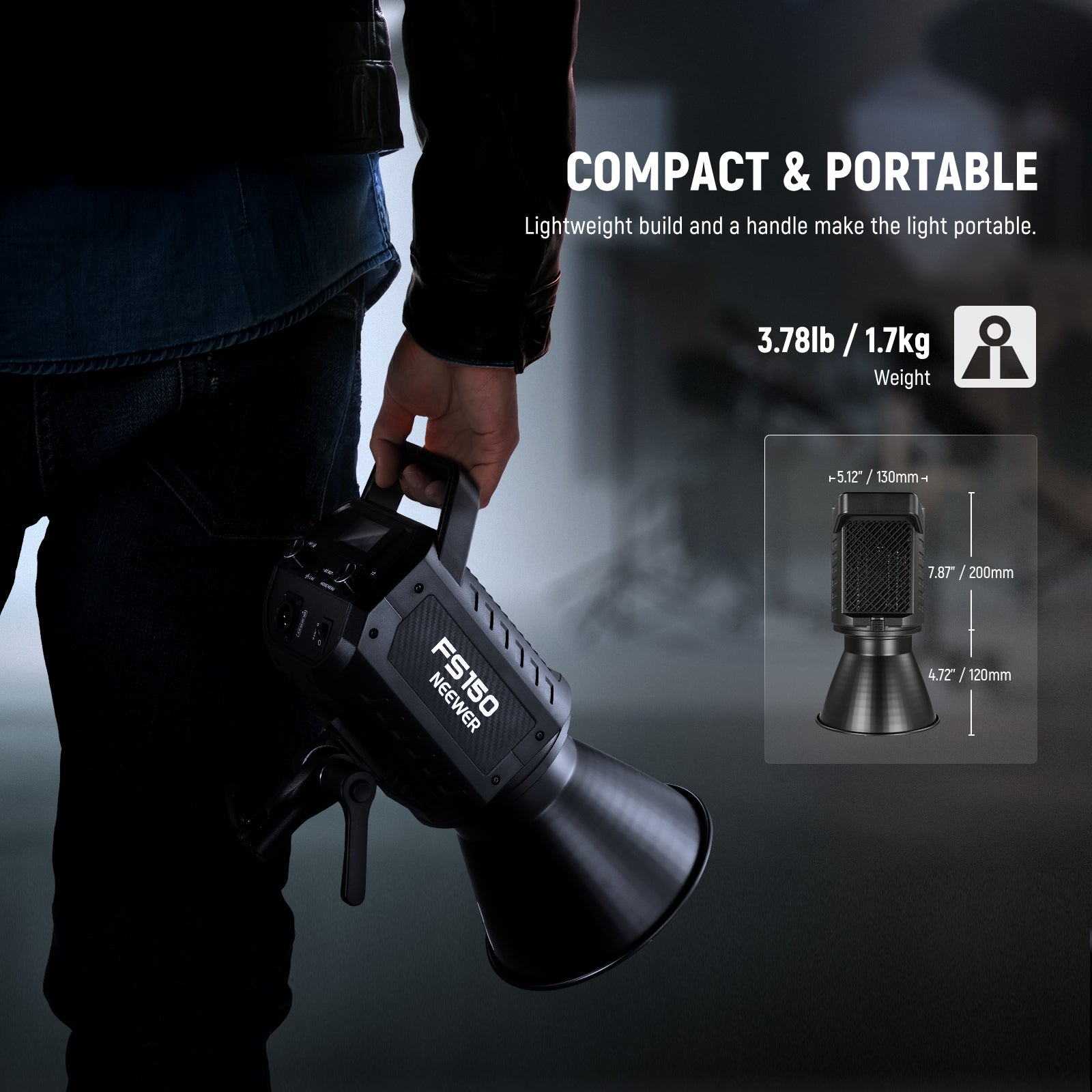 - 130W Powerful Compact Studio Light- NEEWER FS150 Video Lighting uses premium and highly efficient COB LEDs for exceptional brightness, 130W output without flickers, and 102000lux/m maximum illuminance. The portable spotlight weighs only 3.8lb (1.7kg) and measures 7.9"x5.1" x 4.7" (200x130x120mm), with a 180° tilting stand mount adapter for free angle setups—ideal for portraits photography lighting, interviews, YouTube/TikTok video recording, filming, live streaming, and studio production