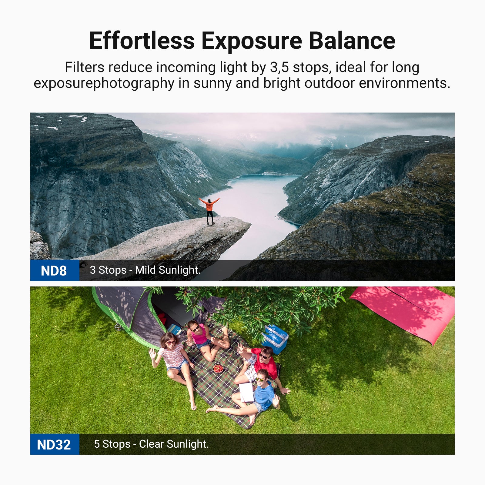 - Effortless Exposure Balance- Four neutral density filters (ND 8/16/32/64) reduce light by 3, 4, 5, and 6 stops for long exposure photography outdoors. They allow you to capture rivers, waterfalls, and other movements with expressive motion blur