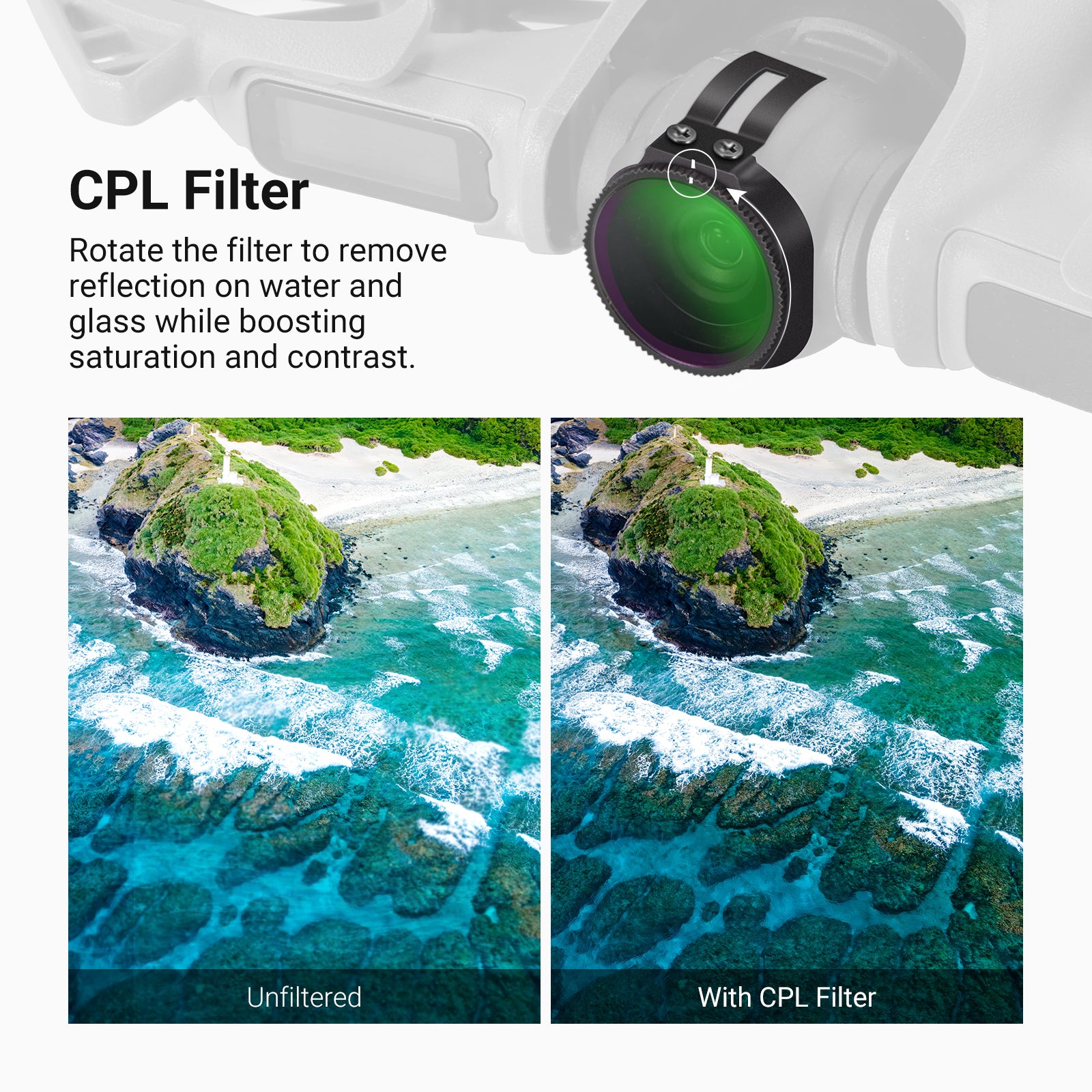 - Minimal Glare, Rich Colors- CPL filter (circular polarizer) minimizes reflection on glass, water, and other nonmetallic surfaces while improving saturation and contrast