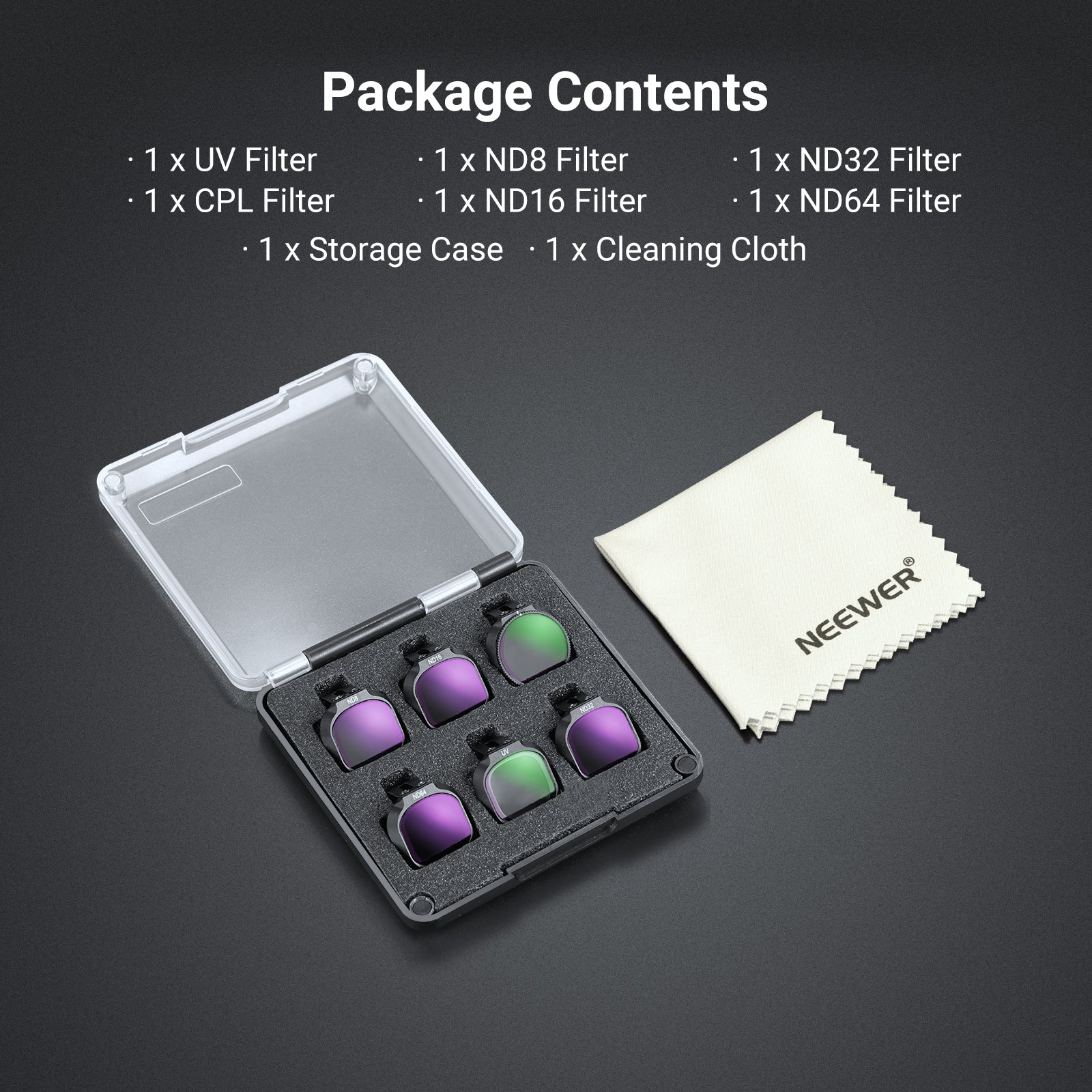 - Compatible with DJI NEO 2- Only compatible with DJI NEO 2 Drone. This filter accessories kit includes 1x UV, 1x CPL (circular polarizing), and 4x ND filter. Lightweight and slim, they preserve the precise gimbal performance