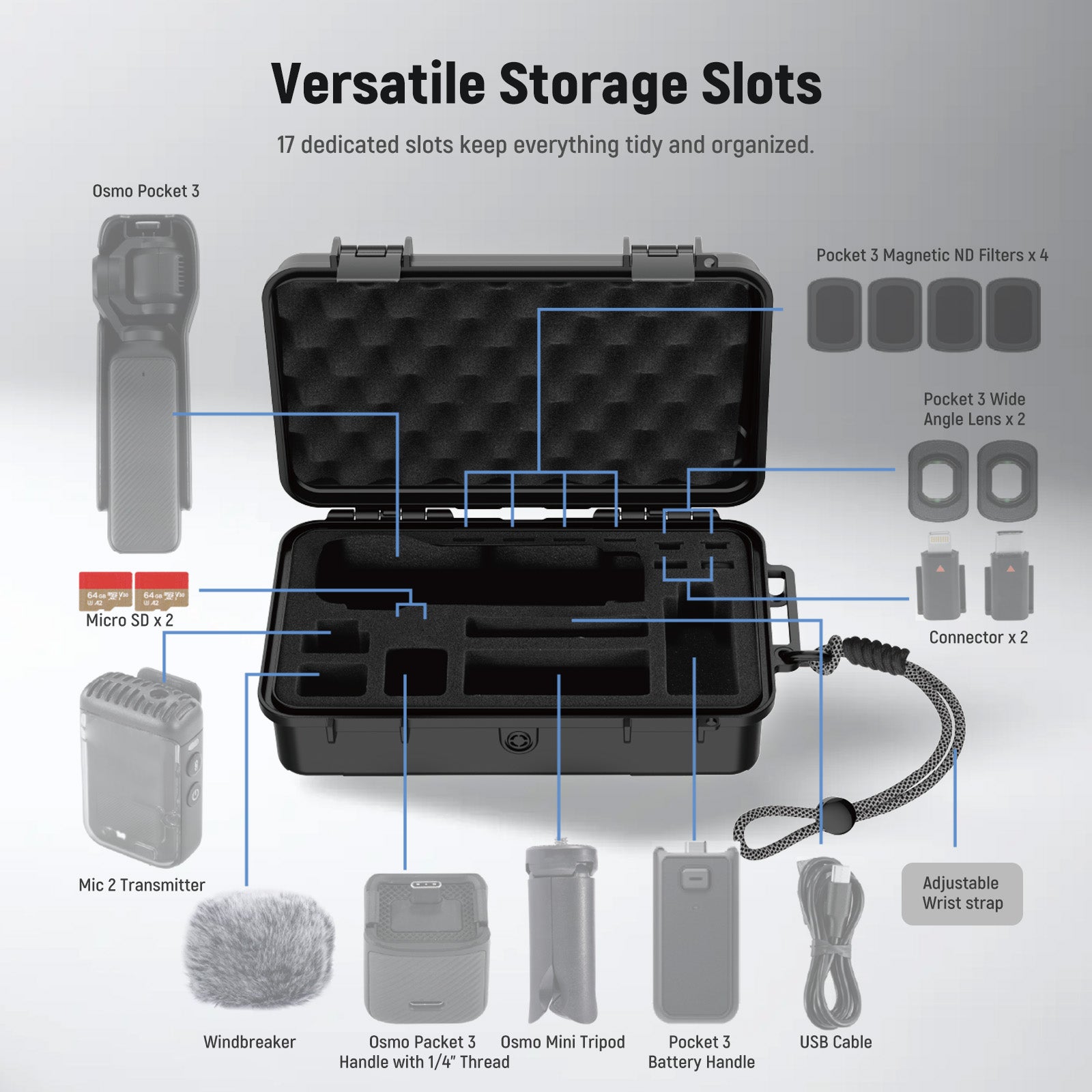 - Versatile Storage Slots- 17 dedicated slots keep everything tidy and organized. 1x Pocket 3 slot; 4x ND Filter slot; 2x Wide Angle Lens slot; 2x OTG Adapter slot; 2x Micro SD Card slot; 1x Mic 2 Transmitter slot compatible with DJI microphone such as mic mini or mic 2; 1x Windscreen slot; 1x Handle with 1/4" Thread slot; 1x Mini Tripod slot; 1x Battery Handle slot; 1x USB Cable slot