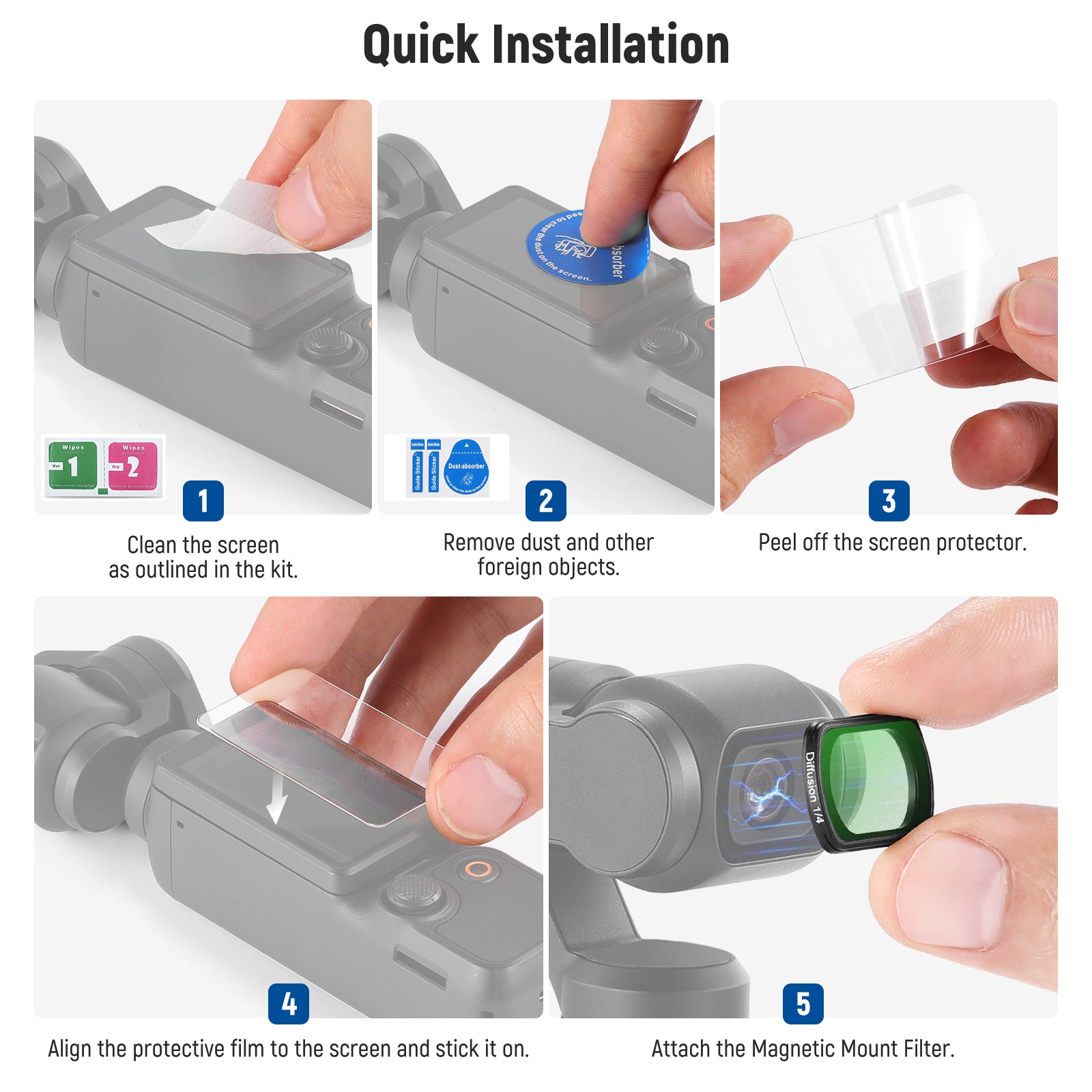 - Fast & Secure Magnetic Attachment- The magnetic design ensures rapid filter changes in just 1 second and provides a secure grip when using auto follow, shooting outdoor sports, or switching between horizontal and vertical shooting. Precision CNC machined aluminum frame seamlessly fits the gimbal without any impact on gimbal calibration. 2 screen protectors are included to help keep your screen from scratches without affecting the touch sensitivity