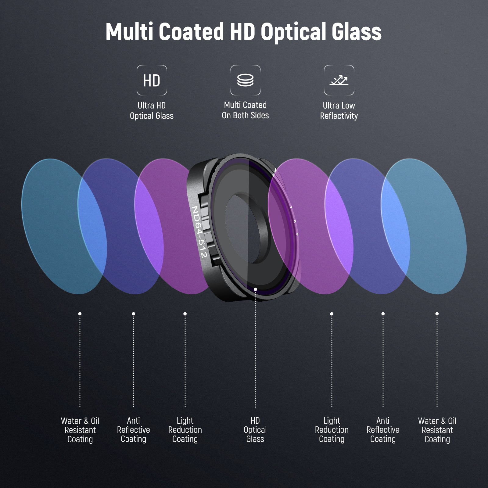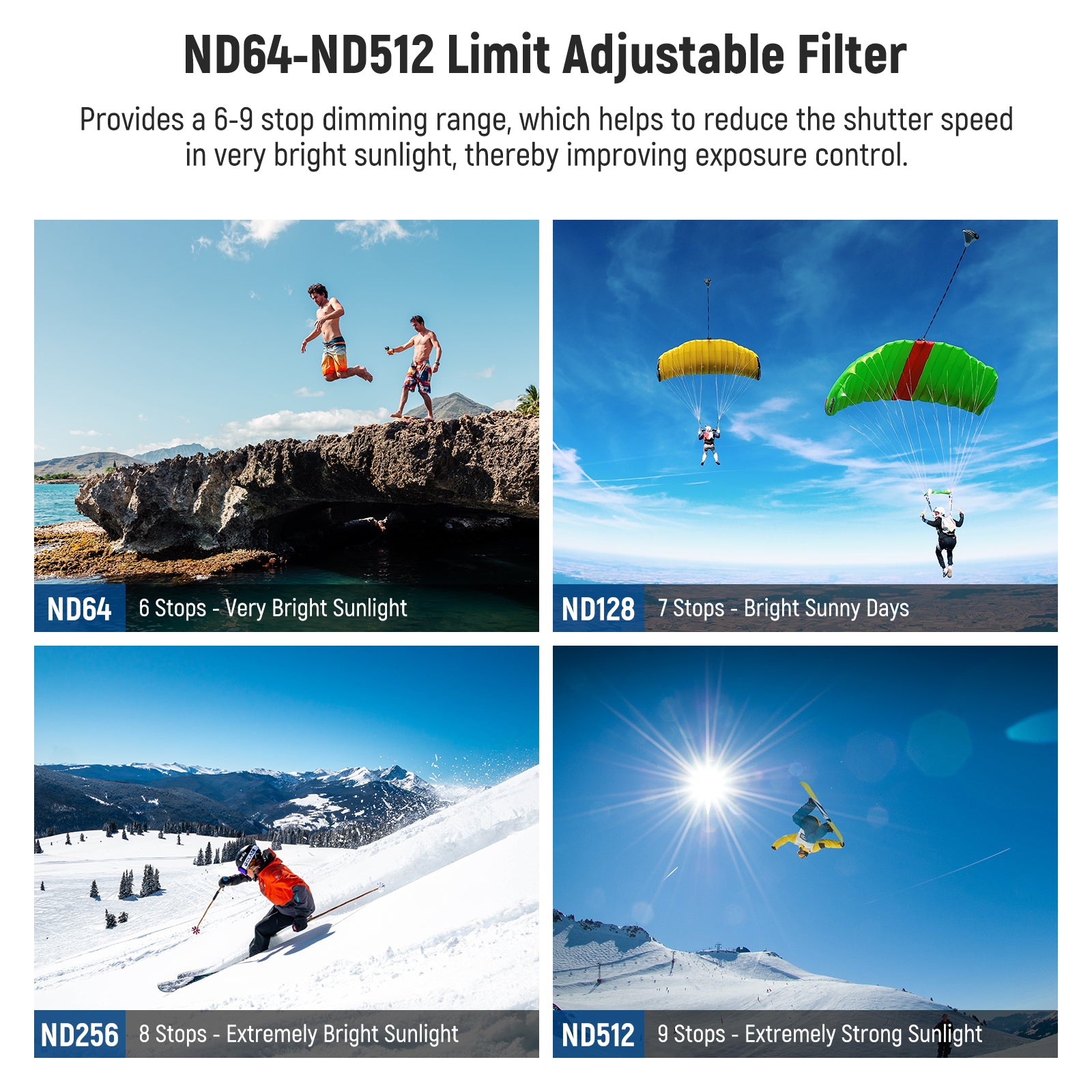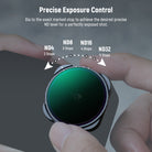 - Variable & Precise Light Control- Hard stops at both ends limit neutral density between ND32 and ND512 (5 and 9 stops). Simply rotate to the exact marked stop to achieve desired light reduction level for accurate exposure control and capture moving subjects with expressive motion blur effects