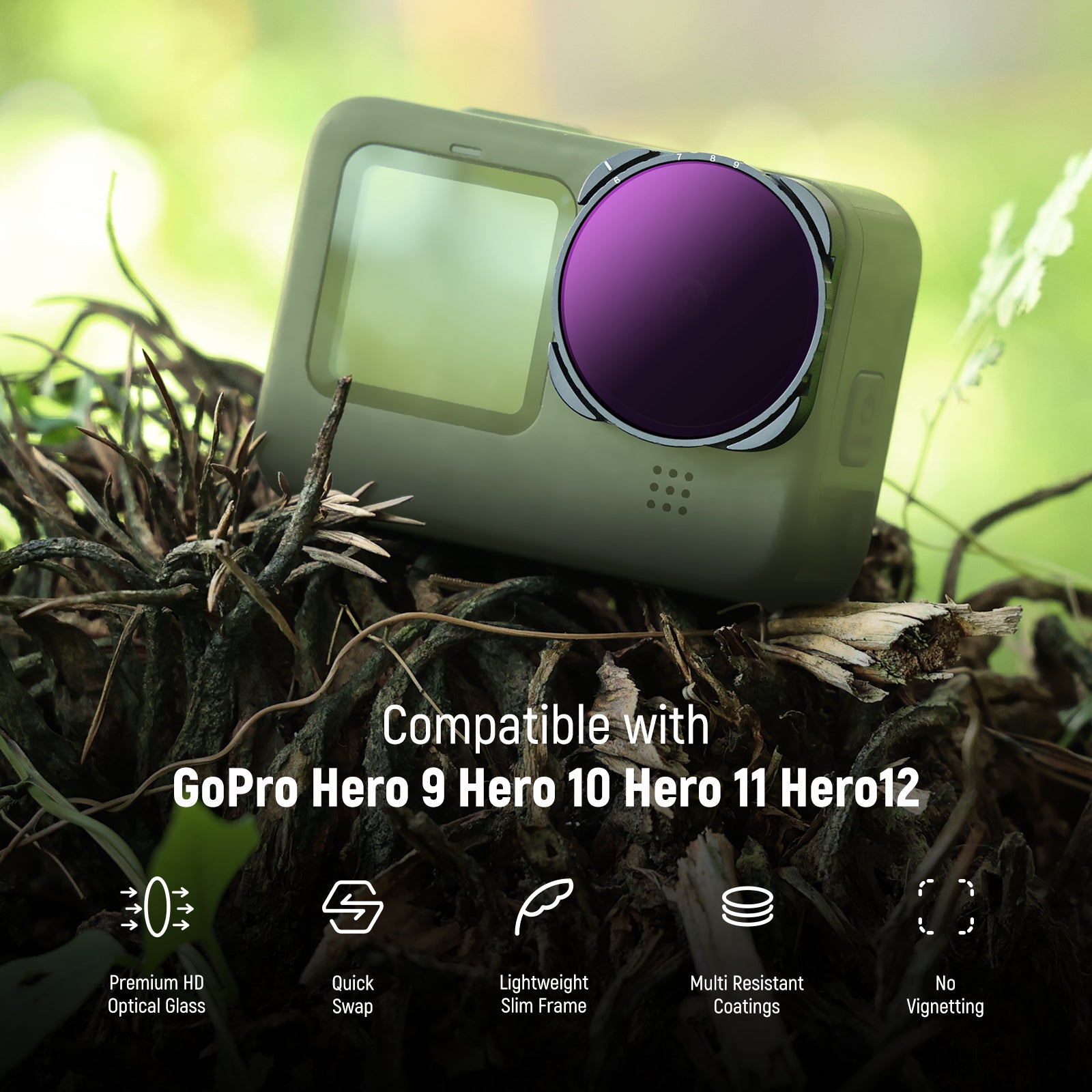- Quick & Secure Attachment- This filter quickly threads onto the camera and stays firmly in place during any sport activity, whether it is surfing, hiking, mountain climbing, or biking