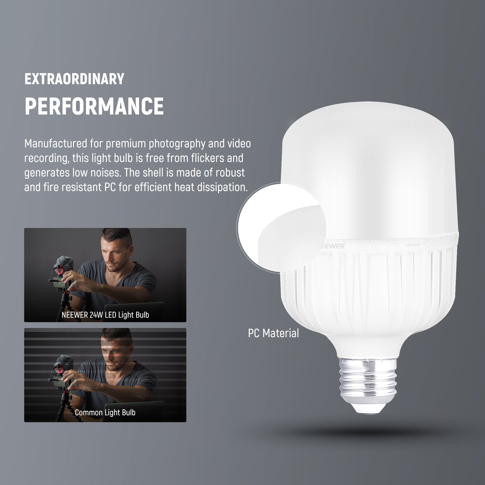 - 24W Bright LED Light Bulb- This 24W LED light bulb brings 2160 lumens and output power equivalent to a 200W incandescent light for studio photography and video shooting. Screw it into a standard E26 socket and get bright illumination right away