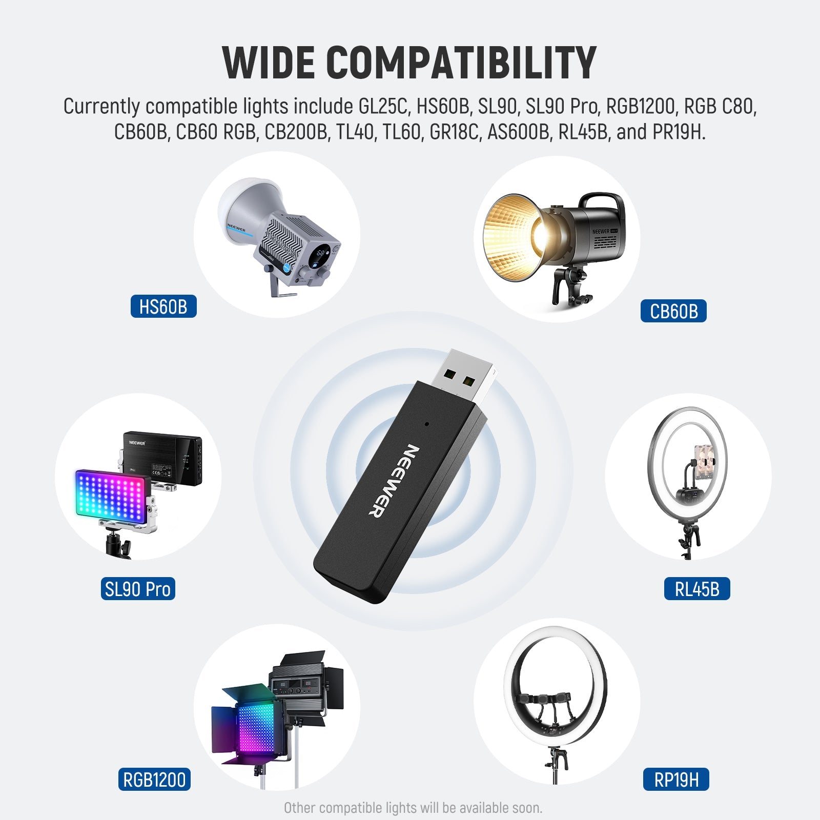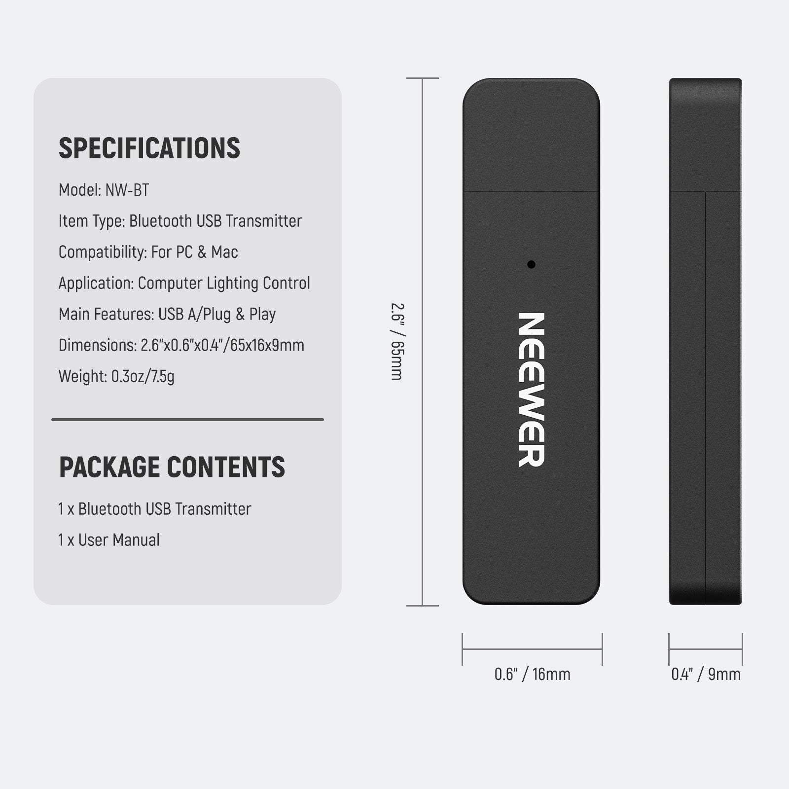 - Bluetooth Transmitter for PC & Mac- This Bluetooth transmitter can turn your computer into a remote control for NEEWER Bluetooth LED video lights and ring lights (except for RGB1 and RGB2), ideal for gamers, online tutors, and Zoom meeting attendees who need to focus on their monitors