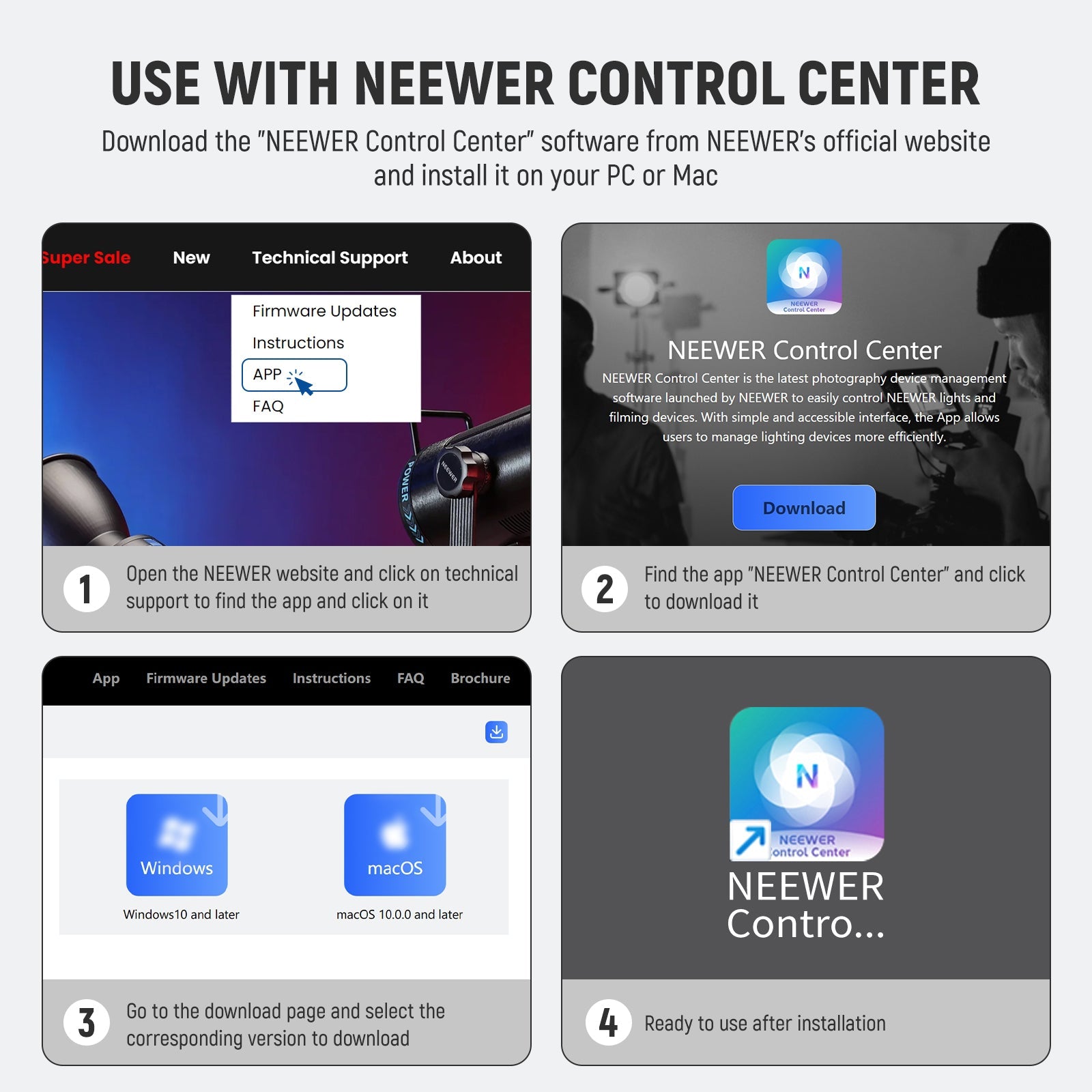 - Use with NEEWER Control Center- Download the "NEEWER Control Center" software from NEEWER's official website and install it on your PC or Mac, then you can use the software to easily control the lighting on your computer with a few clicks of the mouse. Also compatible with Elgato Stream Deck