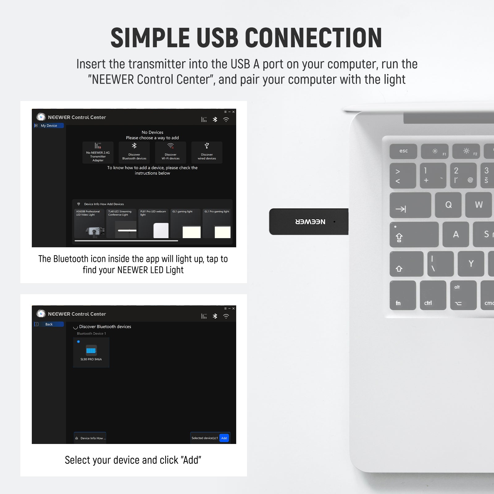 - Simple USB Connection- Insert the transmitter into the USB A port on your computer, run the "NEEWER Control Center", and pair your computer with the light. For some computers, a USB C to USB A adapter needs to be purchased separately