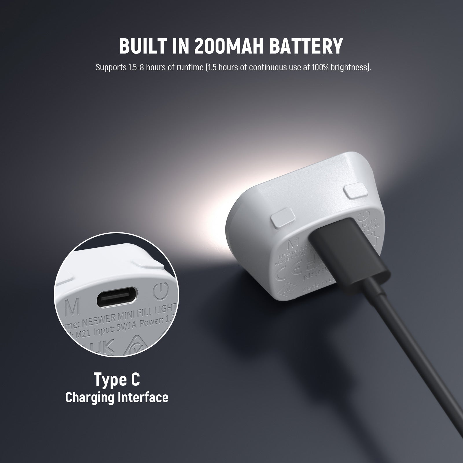 Built in 200mAh Battery- The LED camera light has a built in 200mAh rechargeable battery, supporting 1.5-8 hours of runtime (1.5 hours of continuous use at 100% brightness). Conveniently recharged using a portable charger or other USB power sources via USB C charging