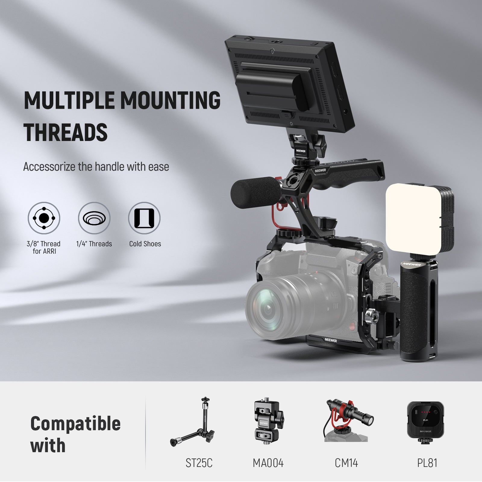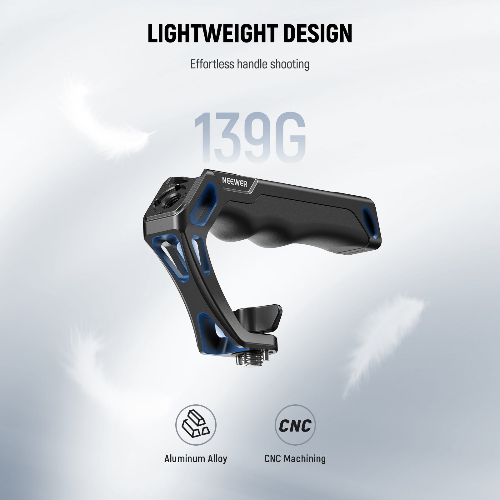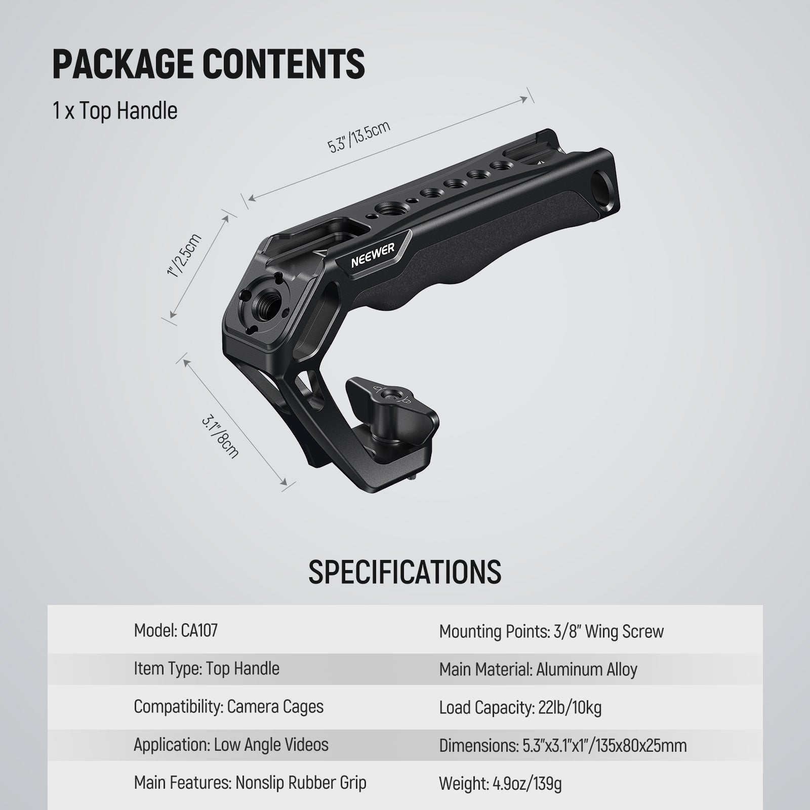 - Quick & Secure Installation- NEEWER CA107 Top Handle can mount on a camera cage through the 3/8" screw and locating pins for ARRI and boasts a 22lb/10kg load capacity. The upgraded wing screw allows you to conveniently secure the top handle without any tool needed