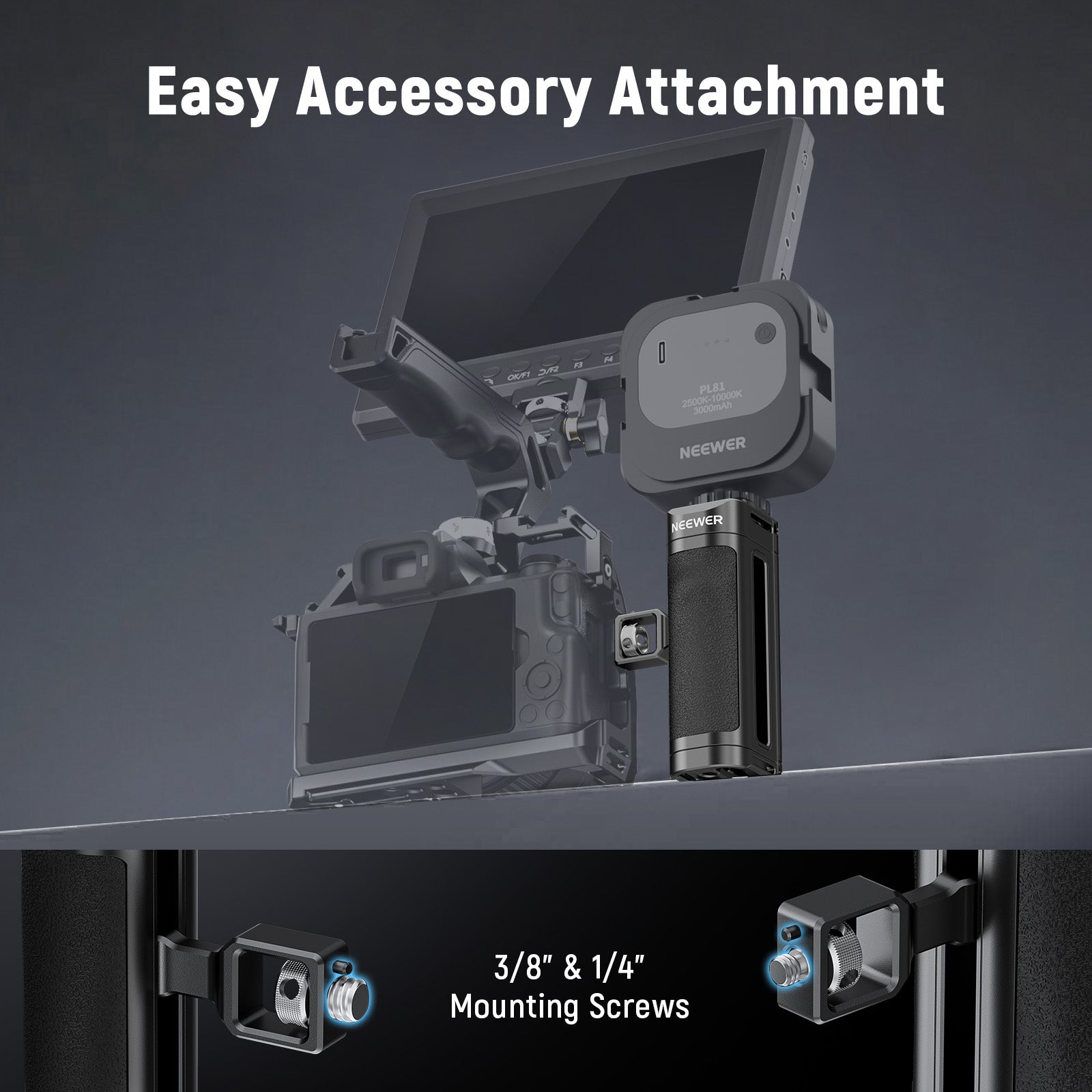- Contoured Side Handle Grip- Suitable for most camera cages, this side handle handgrip lets you stabilize the camera for recording smooth and sharp videos. The nonslip silicone grip with contours ensures a comfortable and firm grasp