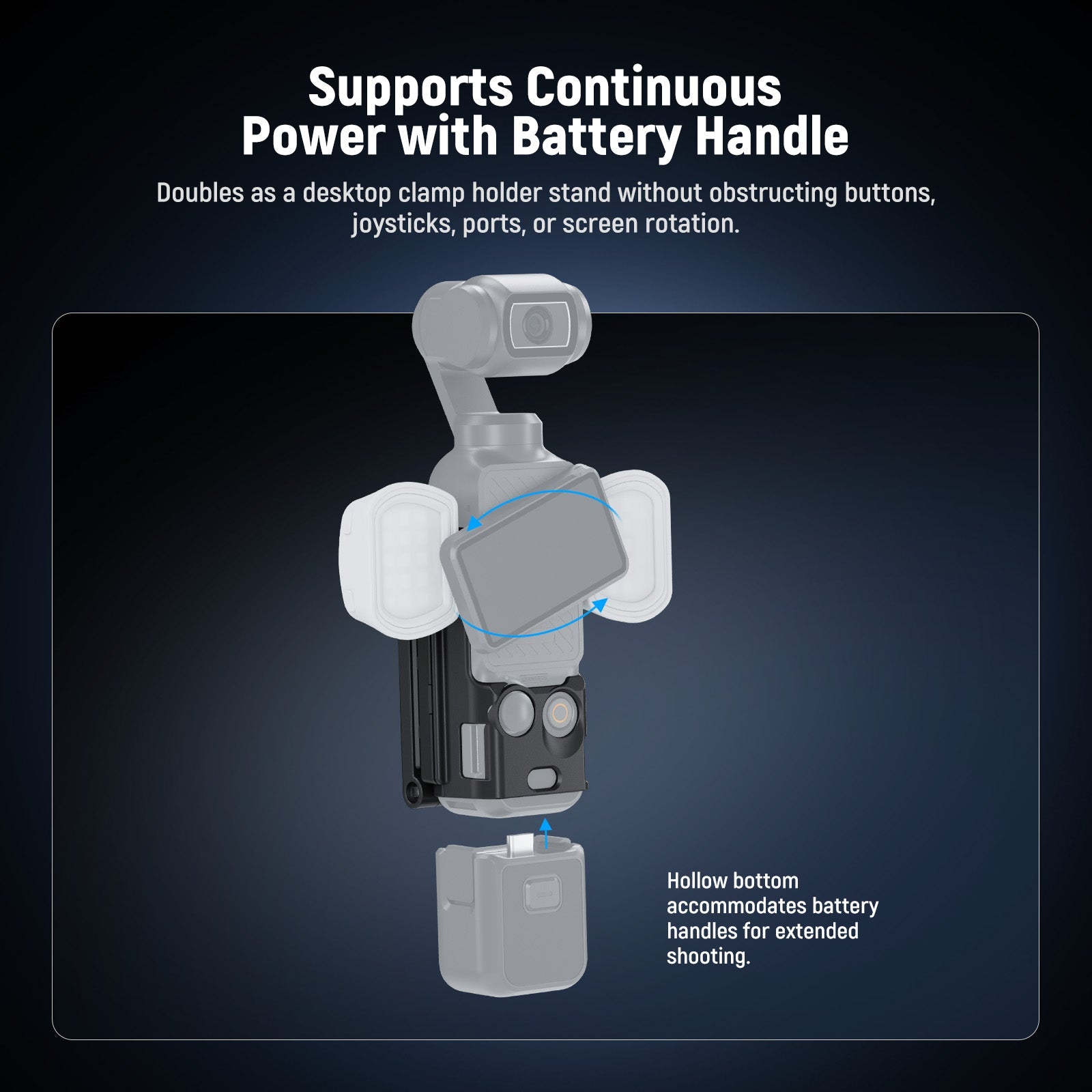 • Upgraded with 1/4" Screw Hole & Two Clamp Interface- Built with a standard 1/4" threaded hole on the stand base and a two-clamp interface on the back, the Pocket 3 cage holder easily connects to tripods, selfie stick, table stands, chest strap mount, backpack clip, bicycle bracket and other accessories, offering many more flexible and stable mounting options for different shooting scenarios