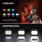- Dimmable RGB Camera Light with 7 Colors- Equipped with 12 premium RGB LEDs, this compact camera light attachment delivers 7 vibrant light colors, including red, dark green, dark blue, light green, purple, light blue, and white, to enhance your creative shots and add dramatic effects to your content. Each mode allows 3 adjustable brightness levels, great for vlogs and social media content creation. Long press the M button to switch to flash mode of the corresponding color