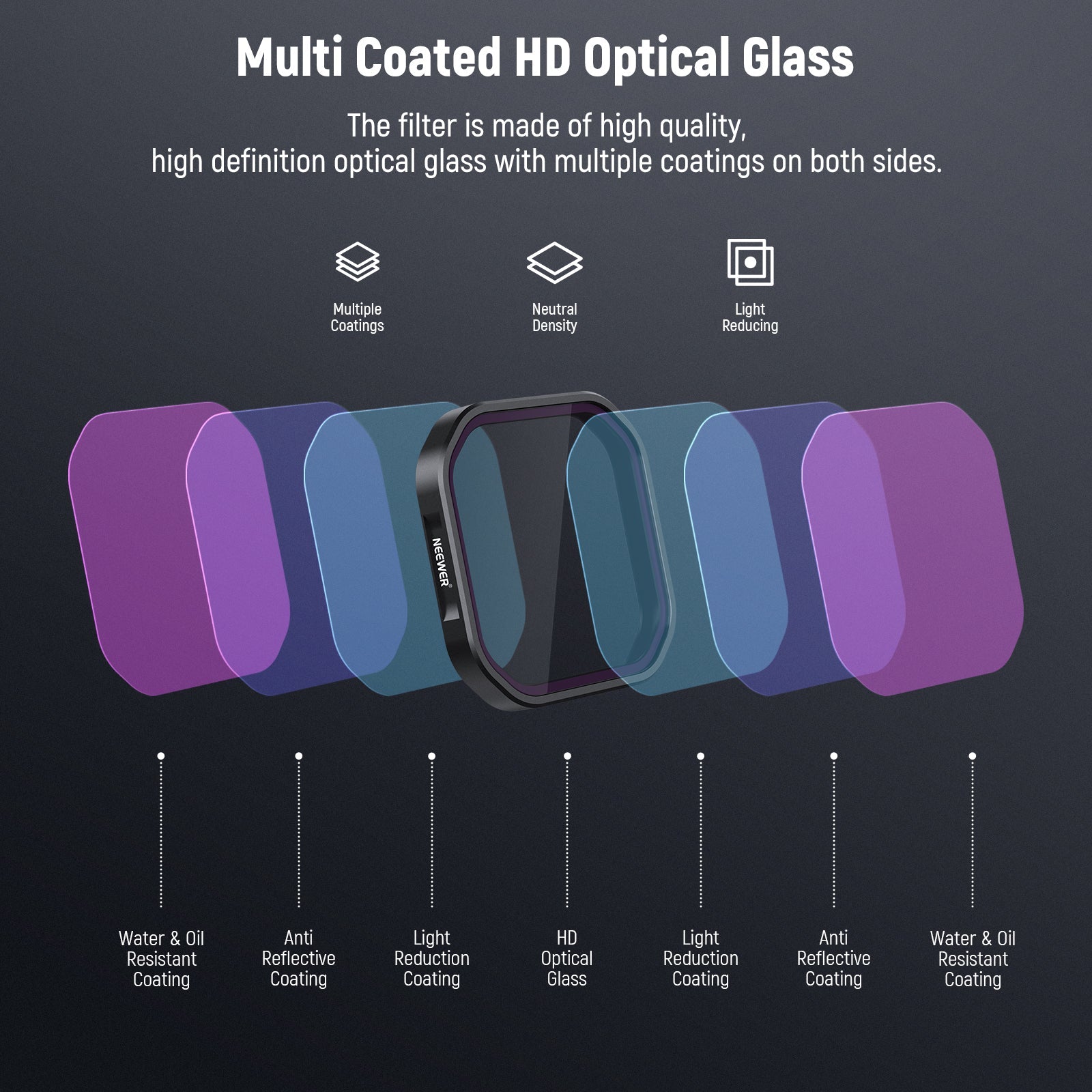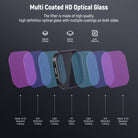 - Multicoated HD Optical Glass- HD optical glass ensures high clarity and accurate color reproduction. Multiple coatings on both sides of the glass are resistant to water, fingerprints, smudge, and scratches, making filters easy to clean