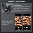 - Important Directions for Use- Before use, please clean all the cameras of your phone. Vignetting may occur depending on phone models. In this case, disable the macro mode, tighten the lens, and zoom the camera magnification to 1.1x or more