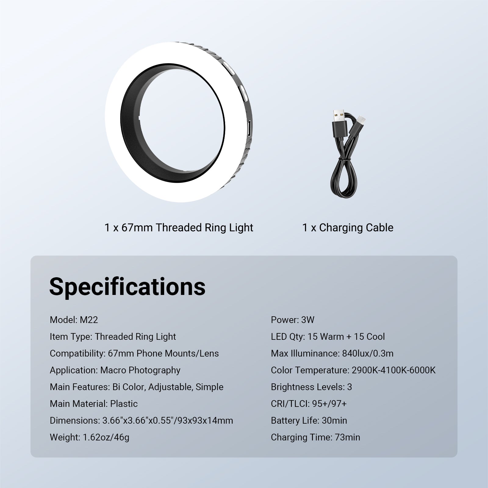 - 1 x 67mm Threaded Ring Light