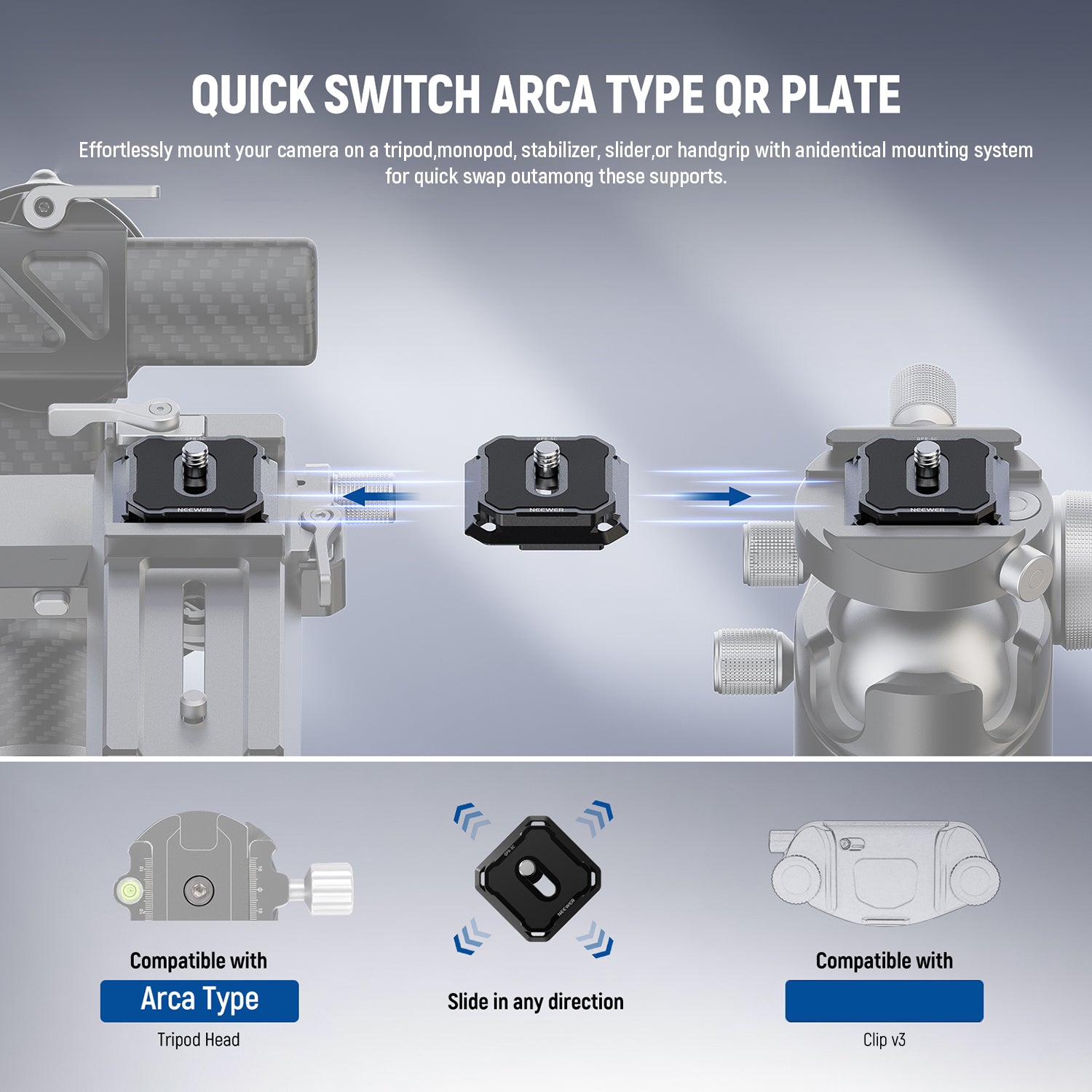 - Quick Switch Arca Type QR Plate- Effortlessly mount your camera on a tripod stand, monopod, stabilizer, slider, or handgrip accessories with an identical mounting system, and ensure quick swap out among these supports. Compatible with arca swiss 38mm plate clamp base, compatible with PD Peak Design Capture clip V3 for backpack shoulder strap. NOT compatible with Ulanzi Falcam F38 DJI gimbal stabilizer
