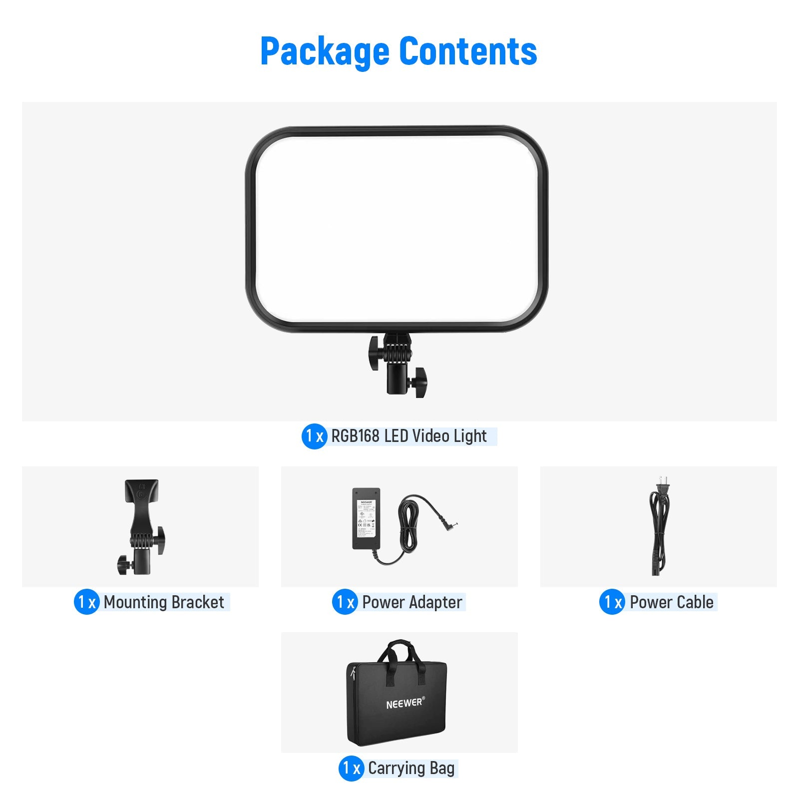 - Power Supply & Detachable Mounting Bracket- 2 power supply methods—the light can be powered by the power adapter (included) or 2 NP-F batteries (not included). The mounting bracket allows for quick installation on a light stand and the carrying bag stores and protects the light and accessories for on-the-go photography and videography