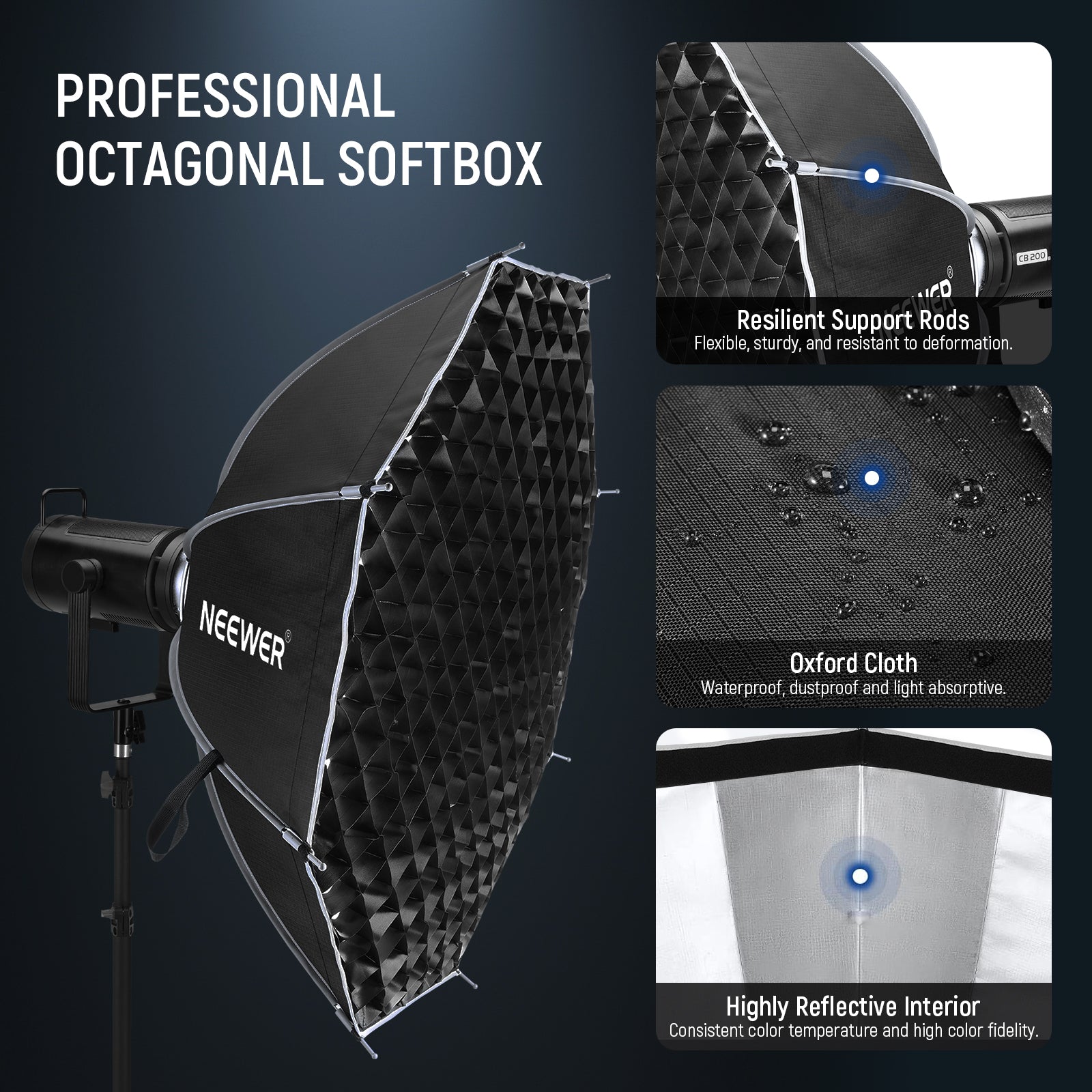 - Professional Octagon Softbox- This 35.4''/90cm octagonal softbox features a smooth, even silver internal coating on the thickened nylon cloth that broadens, diffuses, and softens light while retaining the true to life color rendition. Includes two layers of light diffusers and a honeycomb grid for optimal output