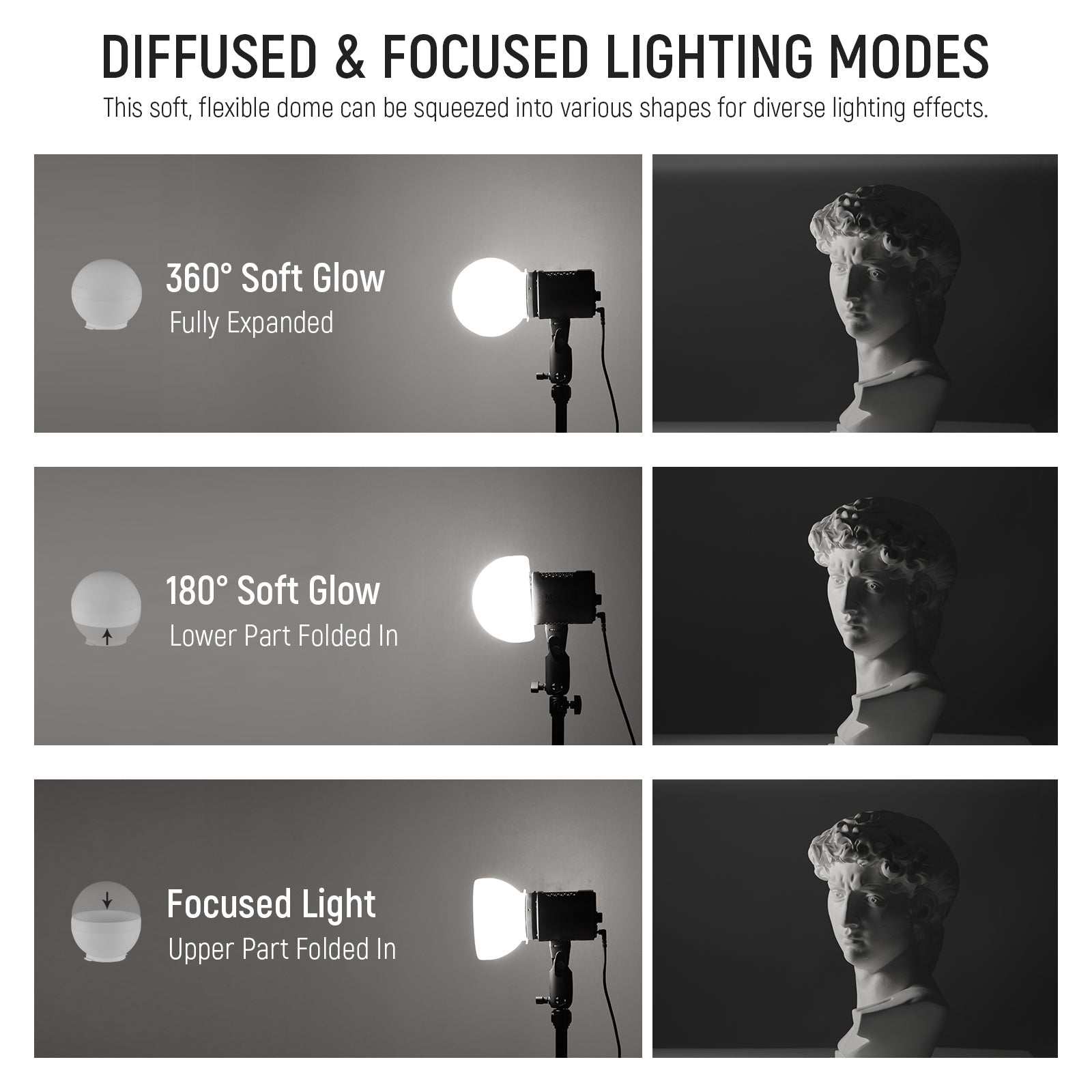 - Diffused & Focused Lighting Modes- This soft, flexible dome can be squeezed into various shapes for diverse lighting effects. Typically, it supports 360° diffused illumination when fully expanded, 180° diffused illuminance when folded the lower part inward, or focused illumination when folded inward the upper part