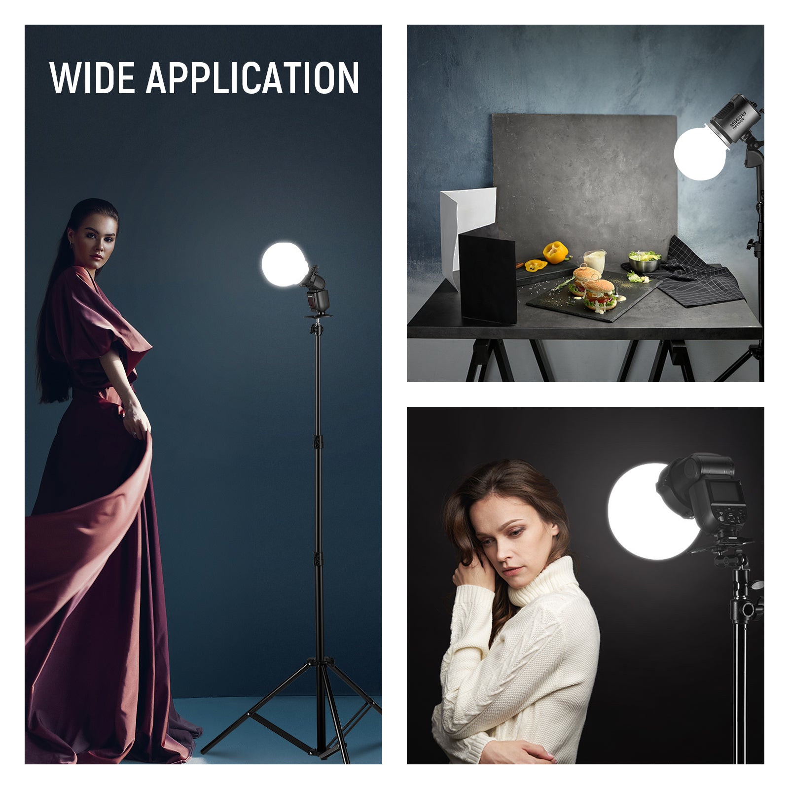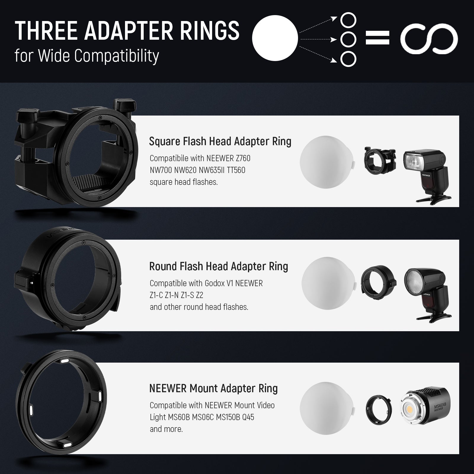 - Secure to Mount- With the 3 types of adapter rings, just a simple twist can seamlessly attach this soft light diffuser dome to common flash Speedlites or the continuous video lights with NEEWER mount. The round head adapter ring with a built-in buckle and the one for the square head with two tighten knobs and a cold shoe for more expansion, all are adjustable, ensuring a perfect fit for different sizes of flash heads